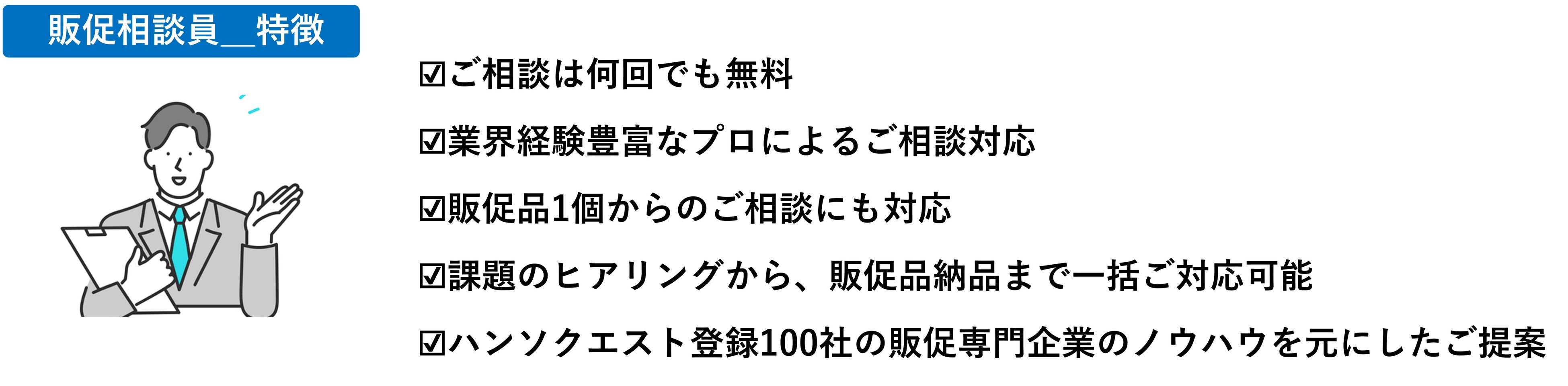 今回新たに、ハンソクエスト内に"販促相談員"サービスを設け、販促に関するあらゆる相談が【無料で】できる窓口を用意し、従来のハンソクエストでフォローができていなかった販促課題に対して、やるべきことが具体化されていない利用者に対して、適切なサポートや解決案の提供を実施することとなりました。
