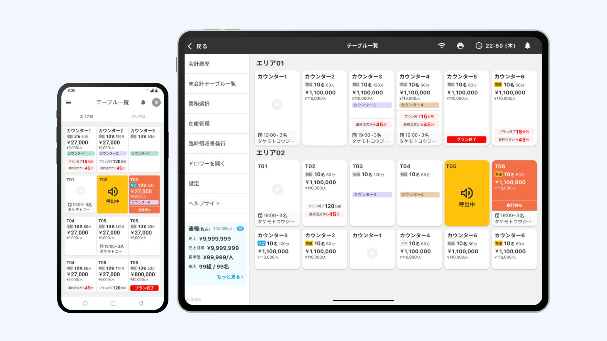 あらゆる業態に対応する「ダイニーPOSレジ」で、ハンディ(※2)・レジで各テーブルの注文状況など情報を表示する画面を刷新しました。(※3)各テーブルの注文状況をひと目で把握することができ、入店時間や最終注文時間からの経過時刻などを表示することで、各テーブルの時間管理などがしやすくなり、店舗での接客力向上と売上アップにつながっています。