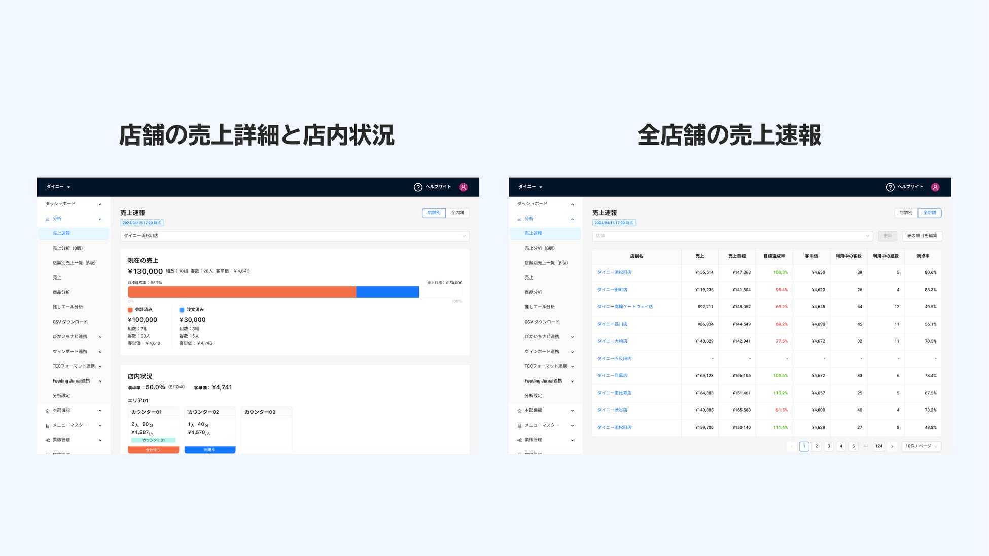 ダッシュボート(※4)の売上速報で、各店舗の売上目標と、それに対する当日の売上状況を見ることができるようになりました。目標に対しての進捗状況をリアルタイムで把握することができるため、追加注文を促すなど狙った集客や客単価のアップが可能になります。また、各店舗の店内の利用状況も確認できるようになったことから、満席時はお客さまを空席がある近隣店舗に案内することもできます。