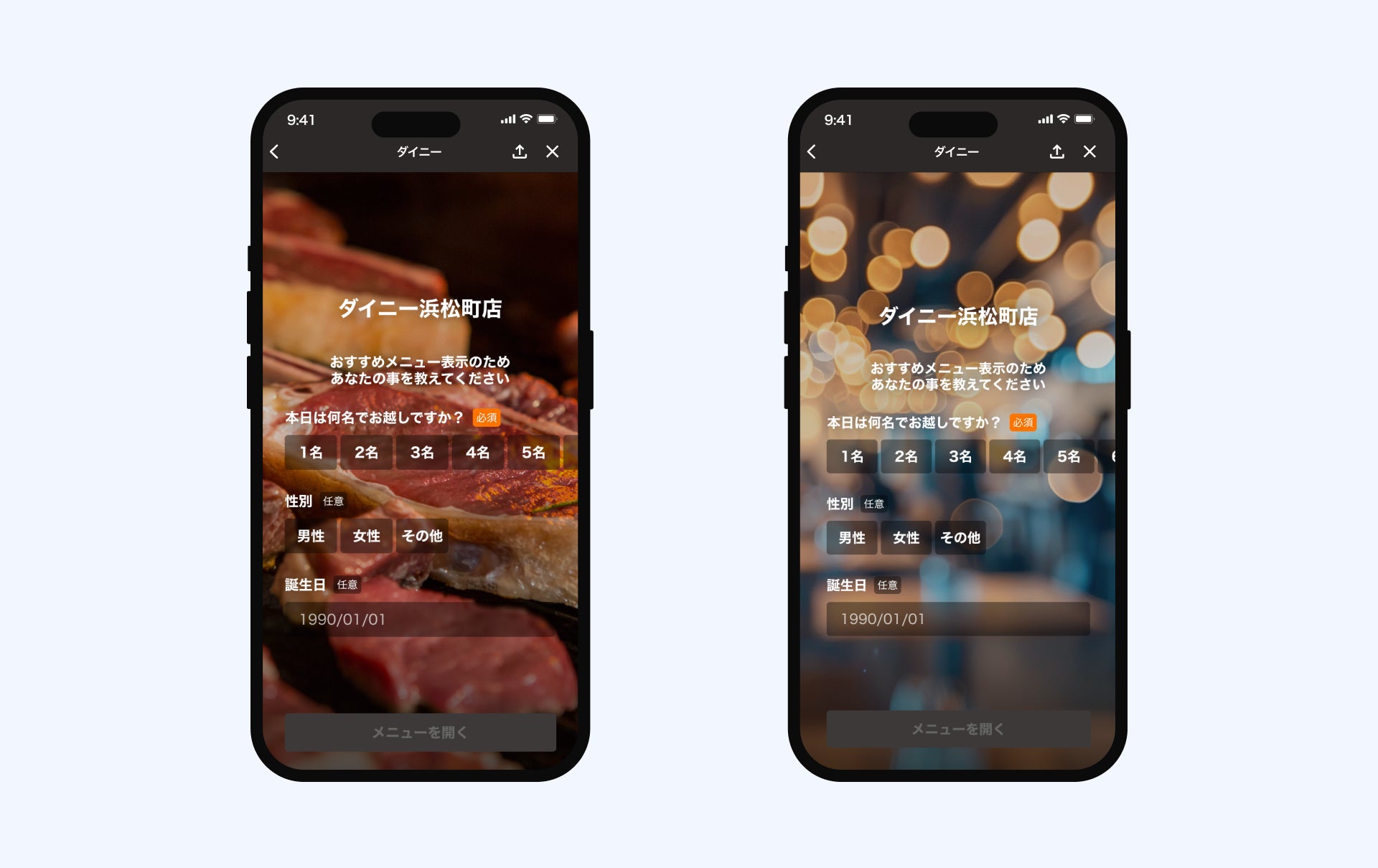 飲食店に来店したお客さまが、モバイルオーダーで注文する際に最初に表示される「ウェルカム画面」をアップデート!シズル感が伝わる料理やお店のロゴなどを最初の画面背景に設定することで、モバイルオーダー上でお店の世界観を演出する他、お客さまへのウェルカムメッセージも添えることができ、顧客満足度の向上が期待できます。