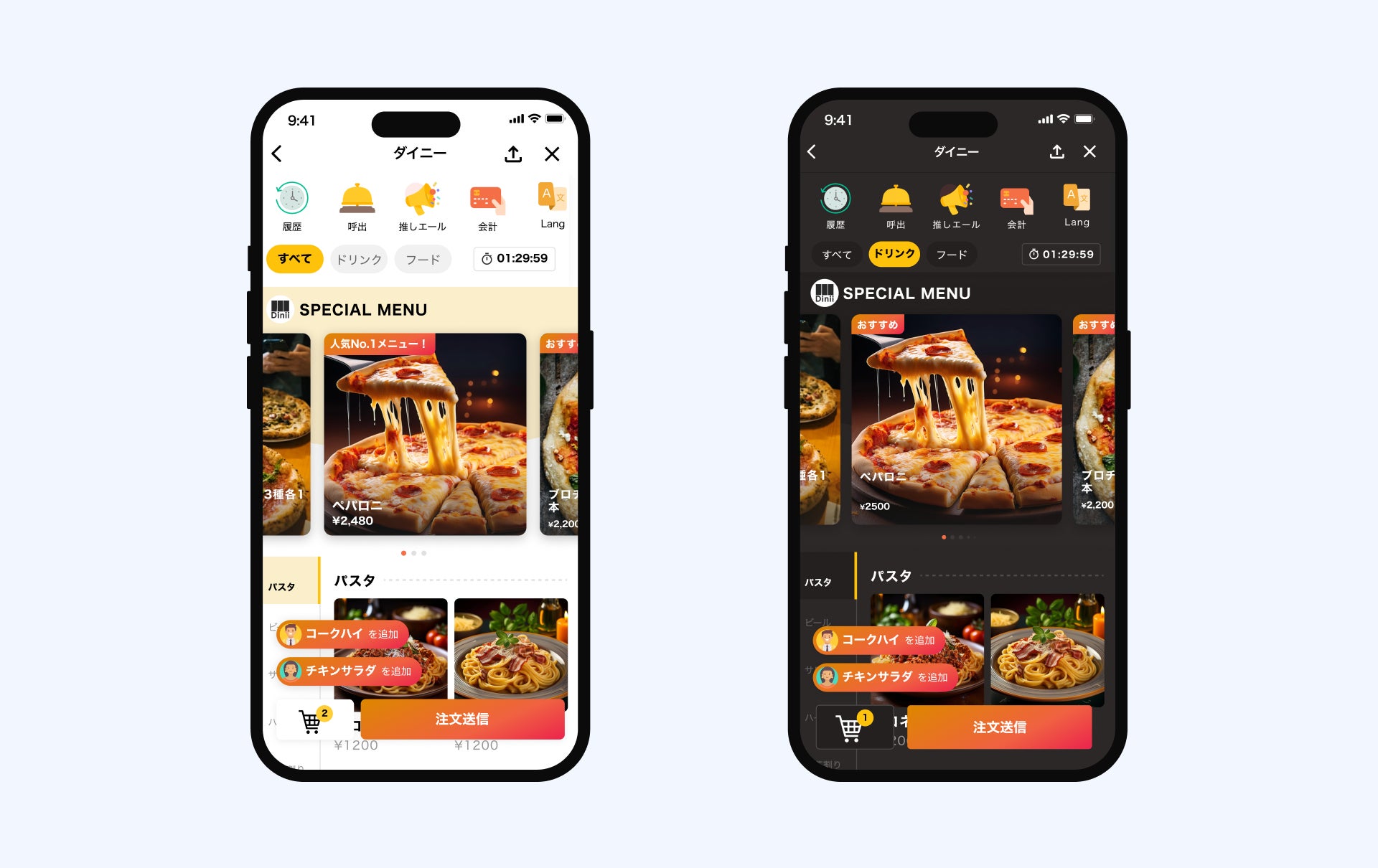 注文体験をもっと楽しくする「ダイニーモバイルオーダー」に、黒を基調とした「ダークテーマ」が登場。(※1)これまで背景色はライトのみでしたが、多くの飲食店から、お店の雰囲気に合わせた背景色を導入してほしいというご要望をいただき、「ダークテーマ」をご用意しました。