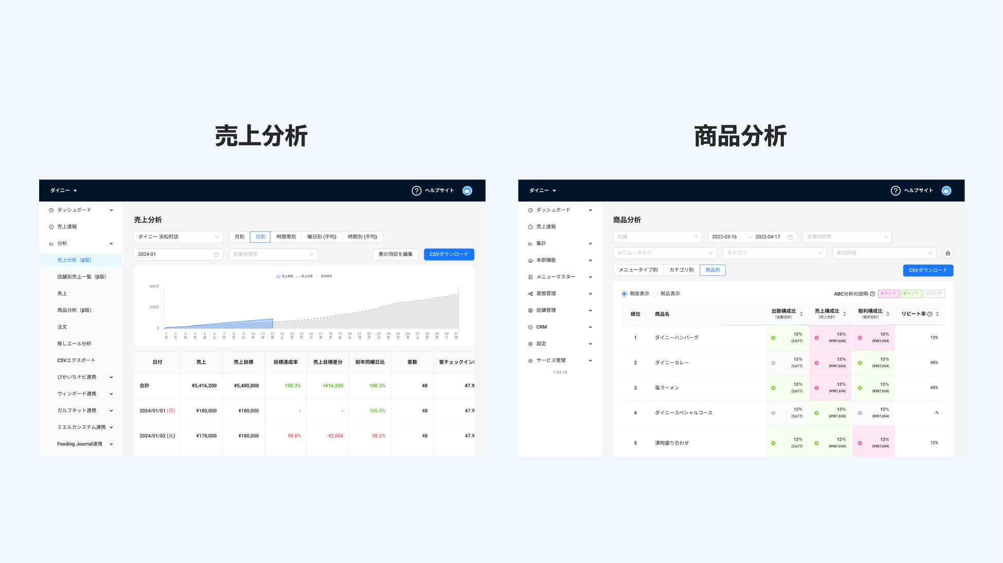 2024年は分析機能も大幅に強化しました。飲食店で活用する一般的な分析からダイニーならではの分析まで様々な分析機能を充実化!売上分析では、日別/月別/時間帯別/曜日別/時間別で売上分析やリピートの分析、商品分析では従来のABC分析だけでなく、各商品のリピート率も分析できます。