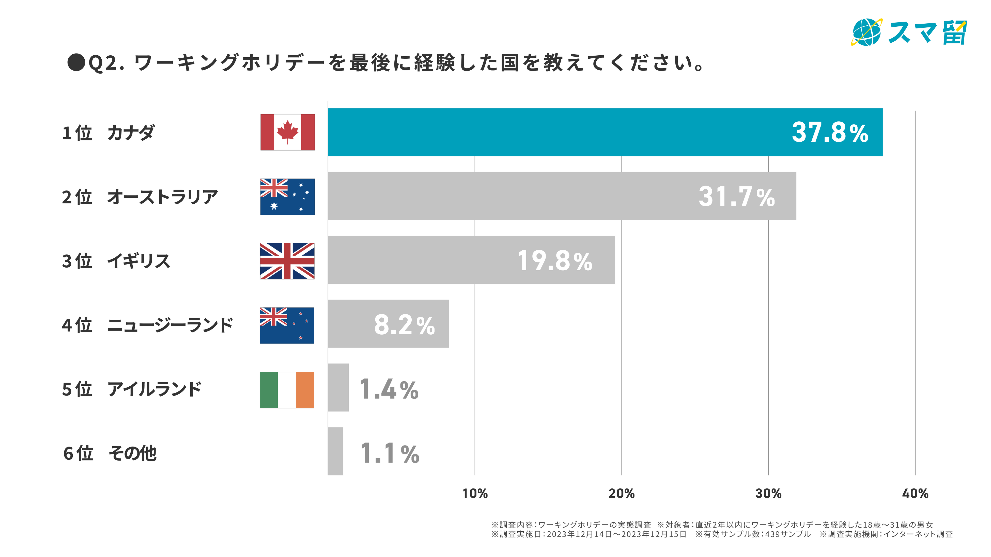 カナダ・オーストラリアが全体の半数を占めており、次いでイギリス・ニュージーランド・アイルランドという結果になった。その他には中国やシンガポールという回答が挙げられた。