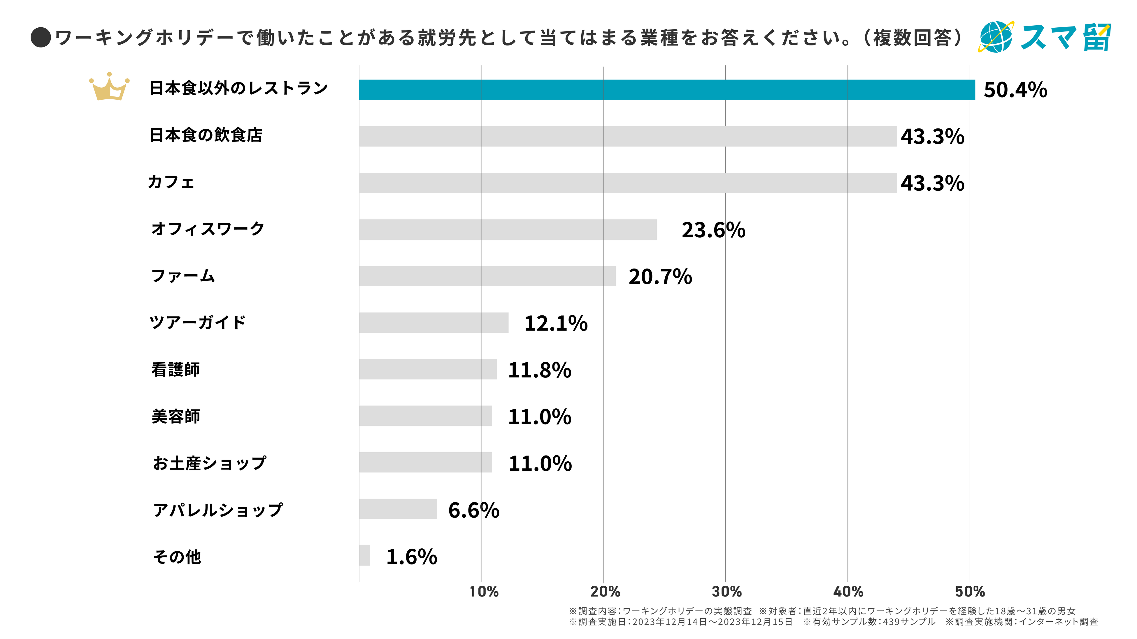 今回の調査では飲食店やオフィスワーク、ファームを経験したことがあると回答された方が多い結果となった。一方で看護師・美容師など、一定の英語力や実務経験が必要となる職種は少ない傾向にある。