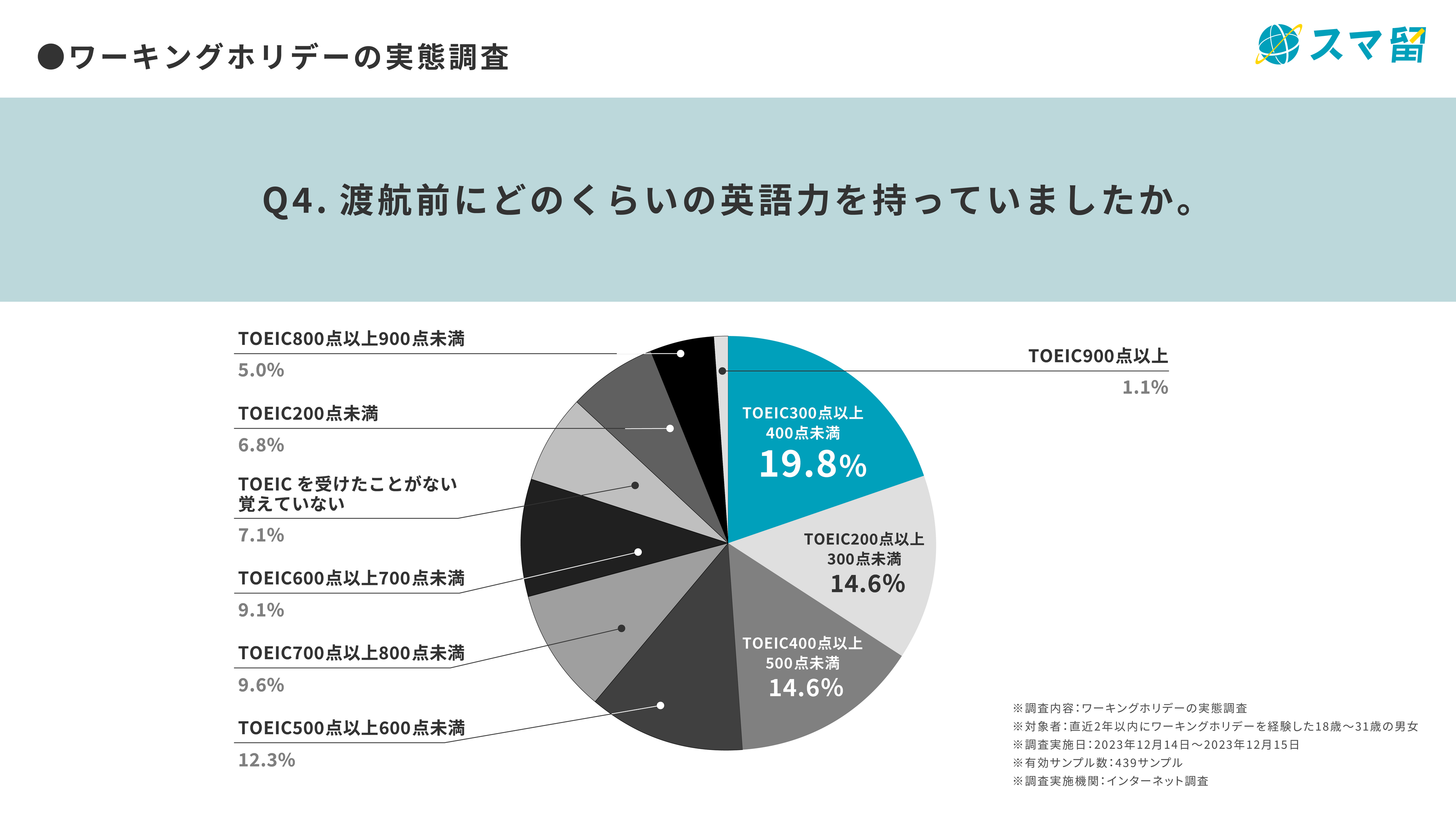 英語力はTOEIC300点~500点台が半数を占めており、600点以上の高い英語力を渡航前の時点で持つ方は少数であることが判明した。