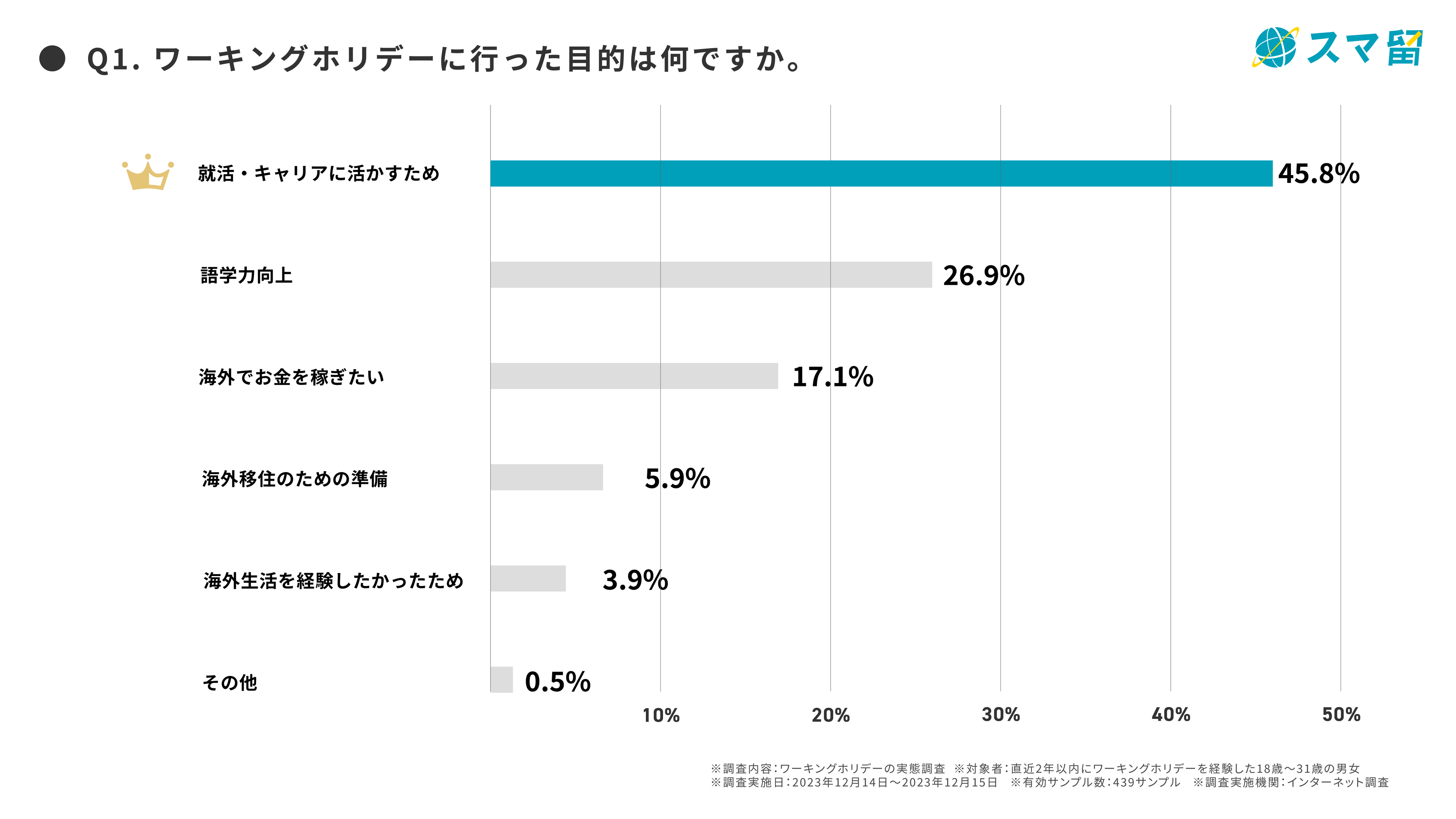 「就活・キャリアに活かすため」が45.8%、「語学力向上」が26.9%、「海外でお金を稼ぎたい」が17.1%という結果に。出稼ぎ留学という言葉が世の中で溢れてきていることもあり、海外で稼ぐという目的でワーキングホリデーを選択する方も一定いるものの、自分自身のスキルアップを目指して渡航する方がまだまだ多い傾向にある。