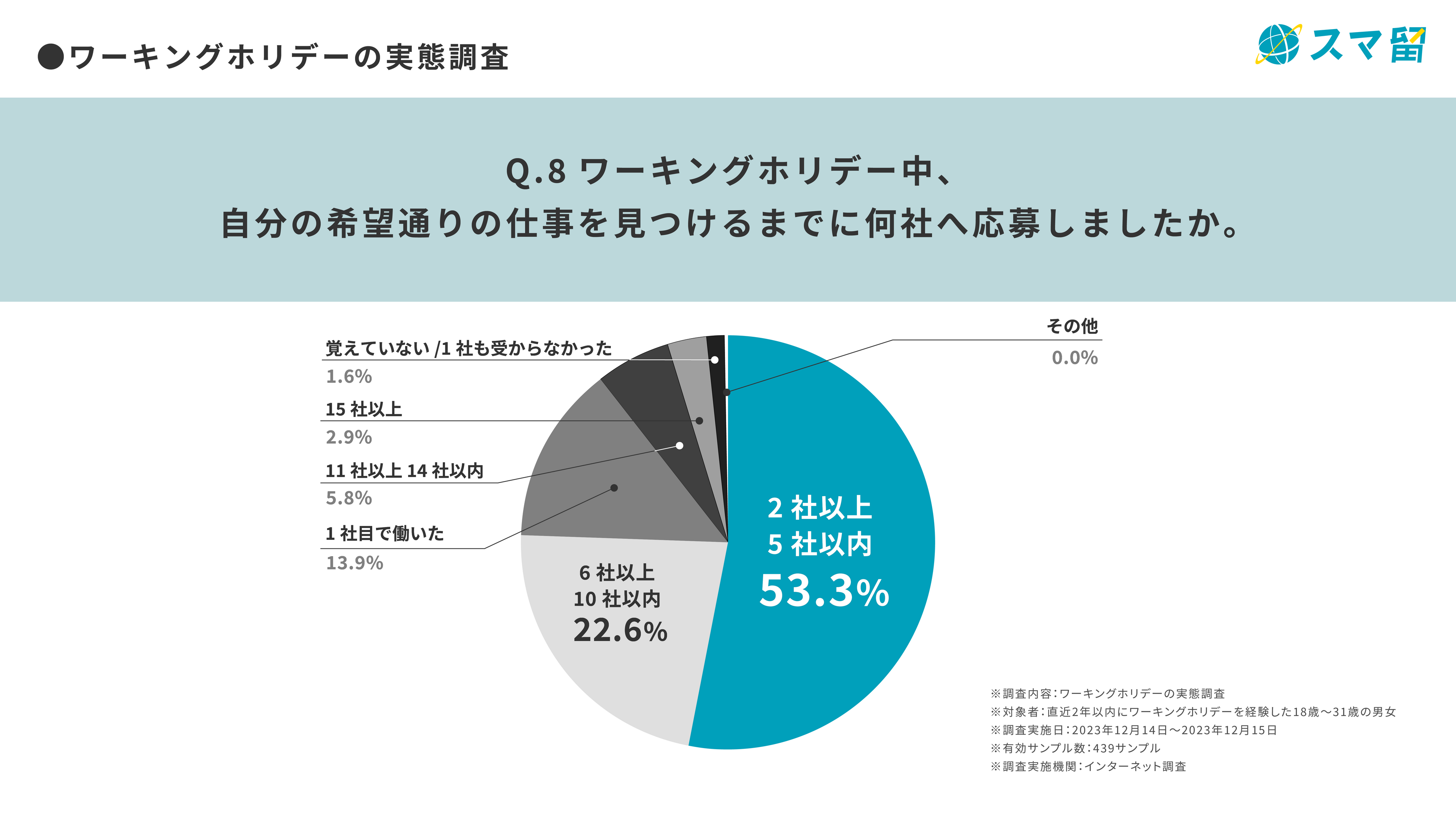 「1社目で働いた」と回答された方は13.9%。中には10社以上応募されている方もいるが、「2社以上5社以内」が53.3%とほとんどの方が5社以内で見つけられているという結果となった。