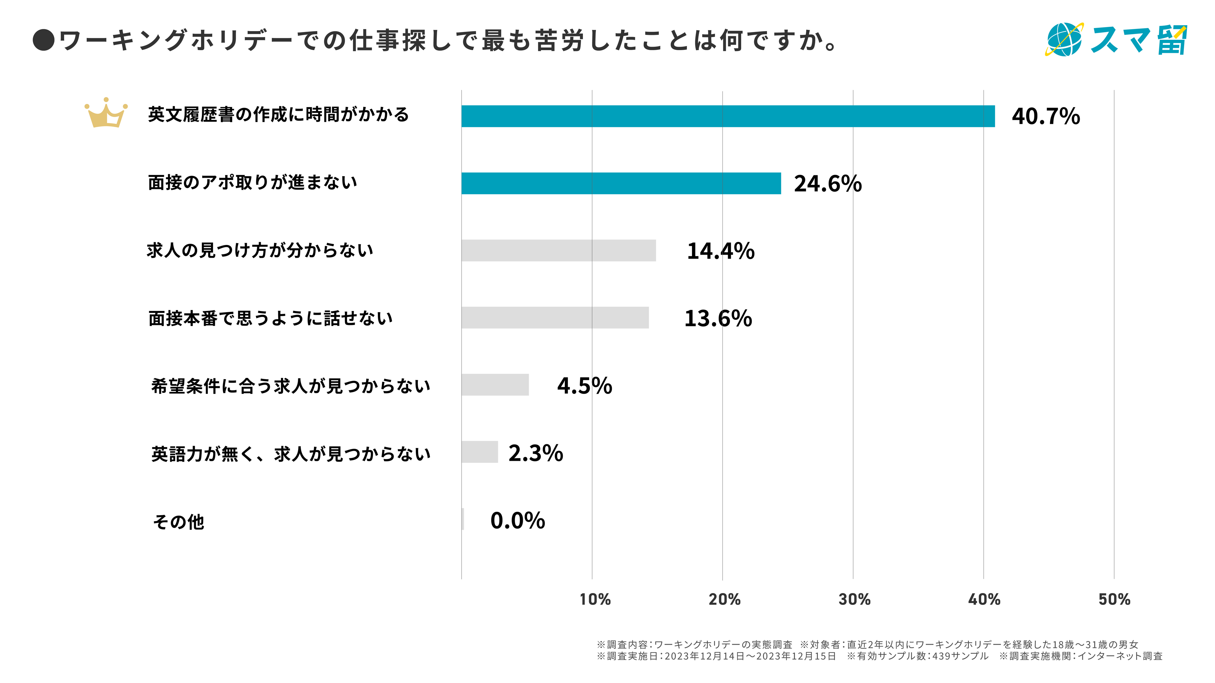 海外留学エージェント「スマ留」がワーキングホリデーの実態調査を実施。ーワーキングホリデーで就労経験がある方の9割が「仕事探しに苦労した」と回答。