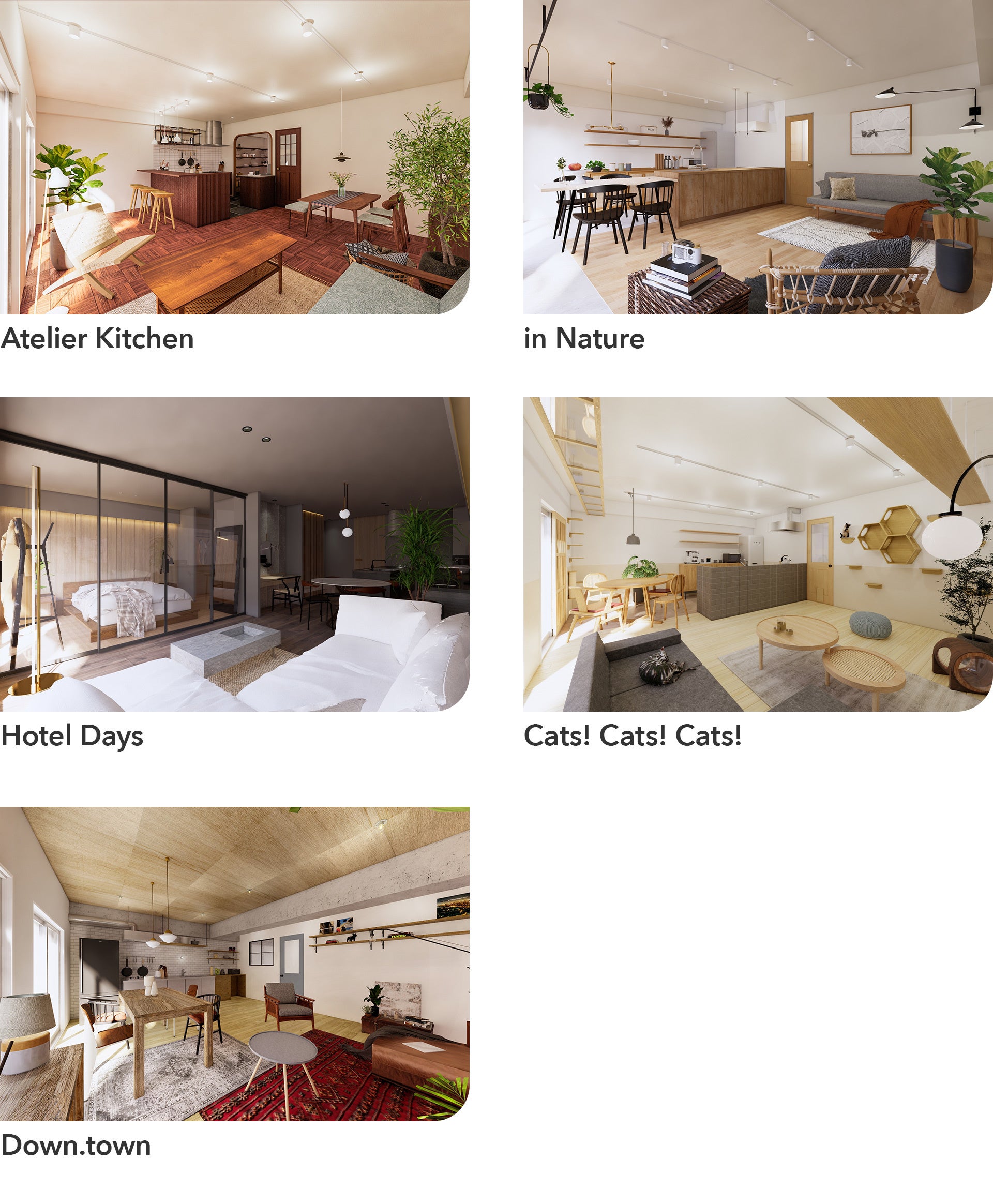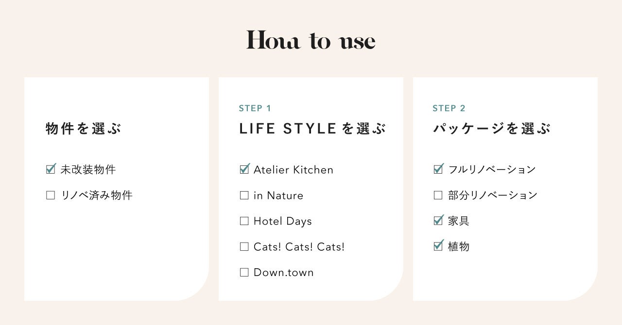 物件購入に合わせて、①カウカモが提案する5つの"ライフスタイル"(内装デザイン)から1つを選ぶ、②リノベーション、家具、植物の3つのパッケージから利用するものを選ぶ、というシンプルなプロセスで利用できます。5つの"ライフスタイル"は、「Atlier Kitchen(アトリエキッチン)」「in Nature(インネイチャー)」「Hotel Days(ホテルデイズ)」など、多様な好みに応えられるラインナップです。