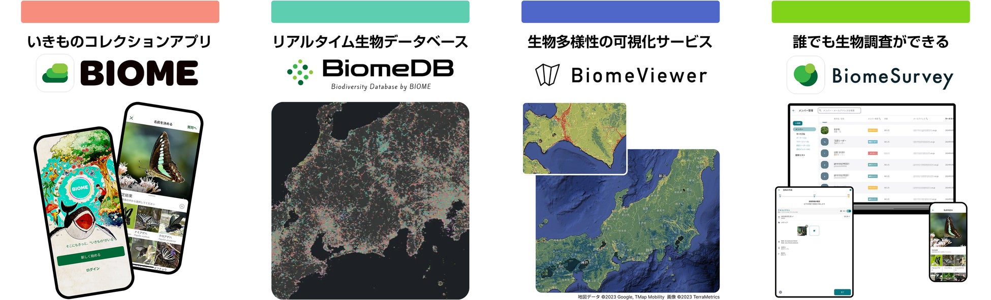 ほかにも、生物調査の計画・実施・データ収集・管理を一気通貫で支援する本格的な生物調査支援ツール「BiomeSurvey」や生物多様性可視化サービス「BiomeViewer」などのサービスもご提供しています。