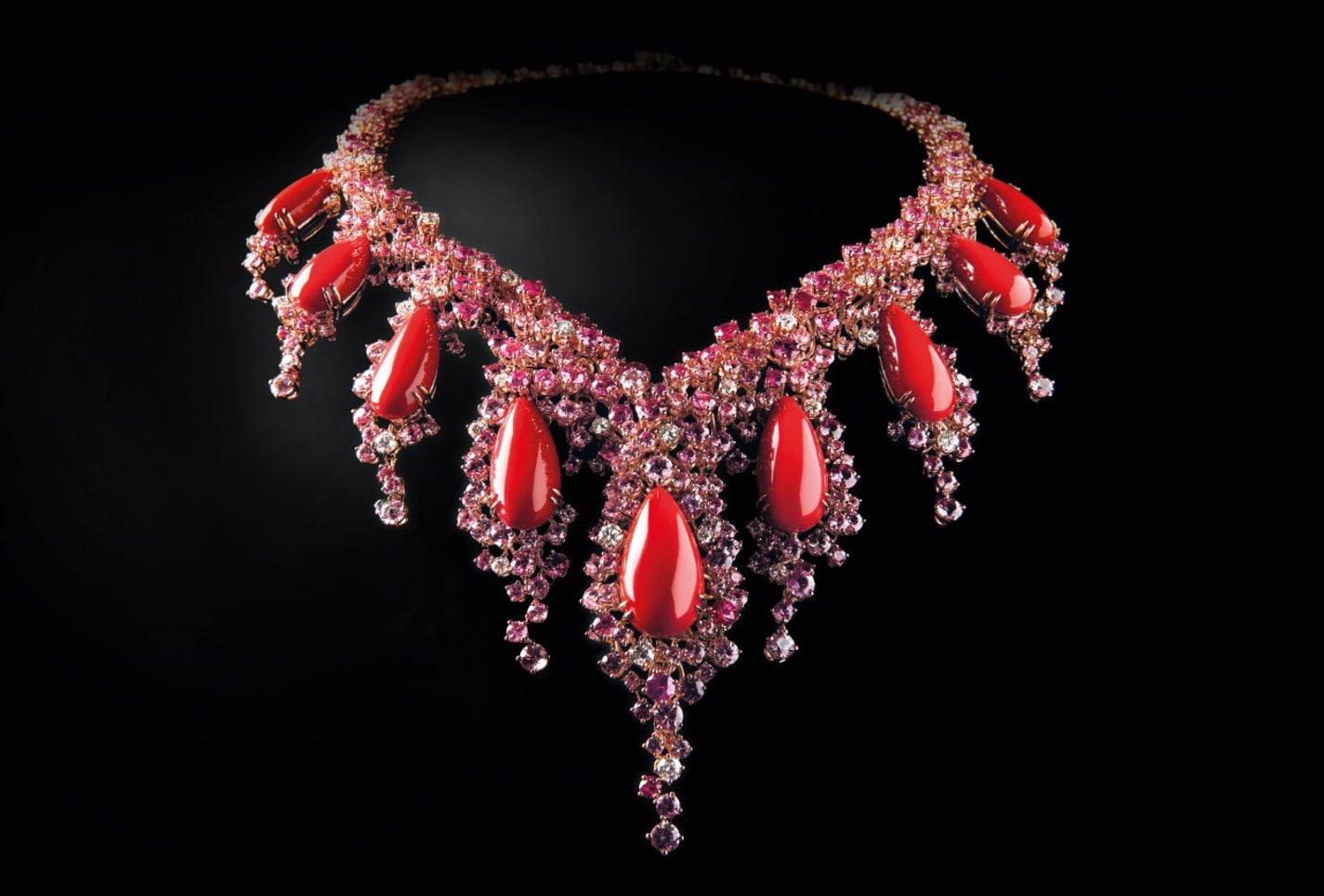 9石の美しいドロップカットのコーラル計75.65カラットをあしらった豪華なピンクゴールドのネックレス。ダイヤモンド48石 計3.83カラット、ピンクサファイア445石計40.98カラット、ルビー91石計7.88カラットのブリリアントカットによって、宝石の深い赤色が巧みに引き立てられています。