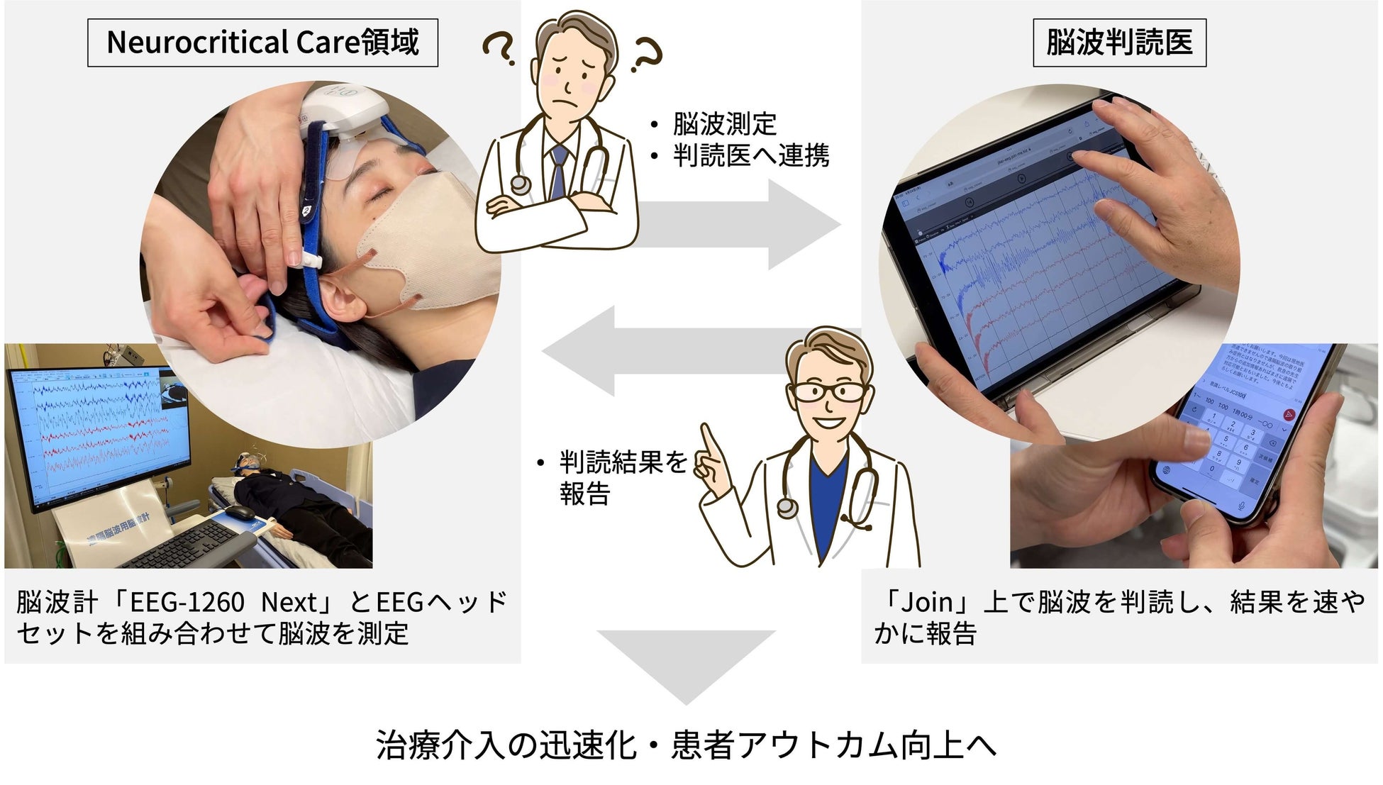 本PoCでは、日本光電製の「脳波計 EEG-1200シリーズ ニューロファックス(EEG-1260 Next)」および簡易脳波測定デバイスである「テレメトリー式脳波計 EEGヘッドセット AE-120A(以下 EEGヘッドセット)」と、アルム製の医療関係者間コミュニケーションアプリ「Join」を組み合わせることにより、Neurocritical Care(神経集中治療)領域における治療介入の迅速化と患者の予後向上に向けた実証を行います。