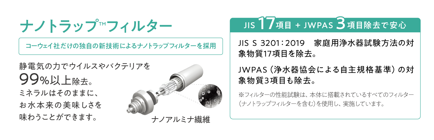 高性能なナノトラップフィルターを採用し、大地が「天然水」を造るように、ゆっくりていねいにろ過します。