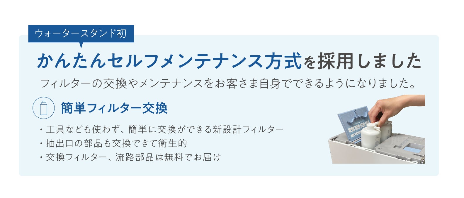 フィルターの交換やメンテナンスをお客さまご自身でできるようになりました。新しいフィルターを6か月ごとにお送りします。