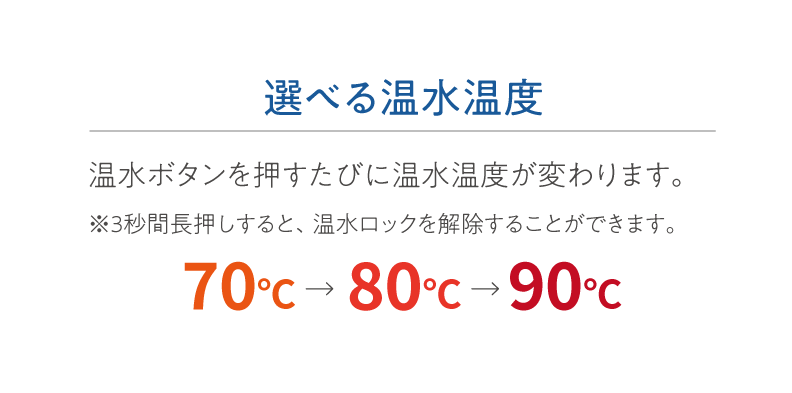 冷水・常温水に加え、温水は70℃・80℃・90℃の温度を選べます。
