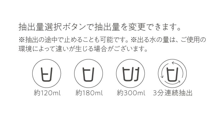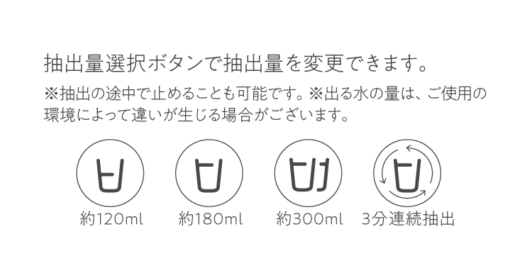 抽出量選択ボタンで抽出量を変更できます。90℃のお湯を3分間(約0.9ℓ)連続抽出することが可能です。