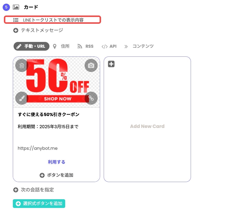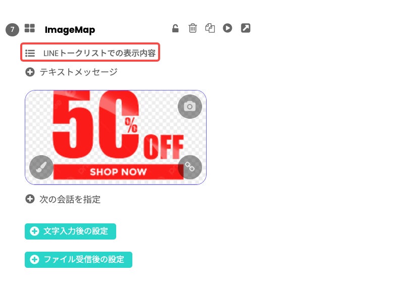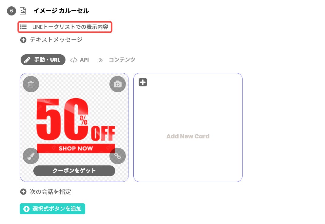 例えば、50%割引クーポンを期間限定で配布する際、トークリストにも「期間限定でクーポンゲット!」などと訴求文言を設定しておきます。