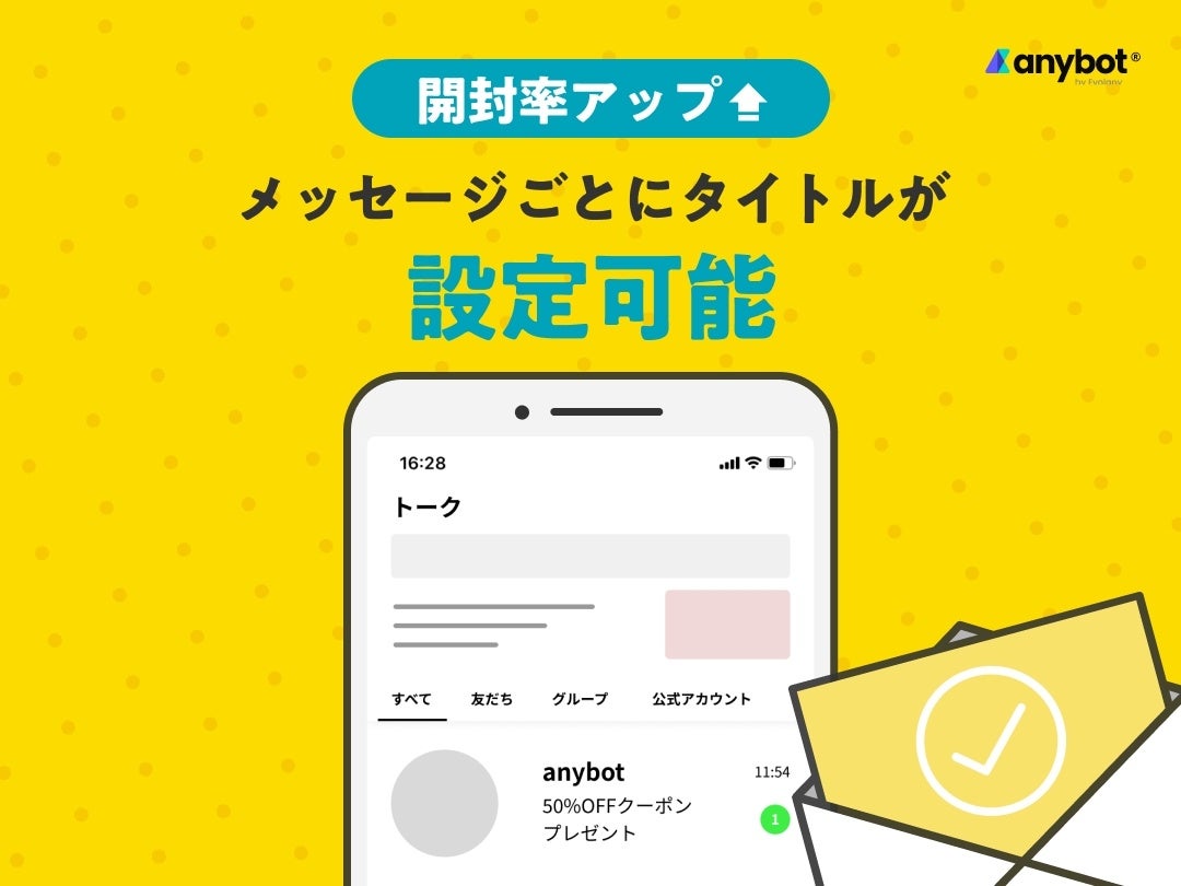 エボラニ株式会社が提供するLINEマーケティングツール「anybot」は2024年2月、カードなどの画像コンテンツを友だちに送った際もトークリストでテキストのタイトルを表示する機能を実装いたしました。期間限定のお得情報や新発売の商品情報などを端的に知らせることができるので、多くのトークルームが並ぶ中からユーザーに自社のトークルーム開いてもらう可能性を高められます。