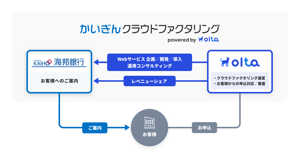 OLTAと沖縄海邦銀行とのクラウドファクタリング事業における提携では、OLTAがWebサービスの企画・開発・導入および運用におけるコンサルティングを沖縄海邦銀行に提供し、沖縄海邦銀行は自社ブランドの金融商品のサービスラインナップに加え、法人・個人事業主のお客様にご案内します。