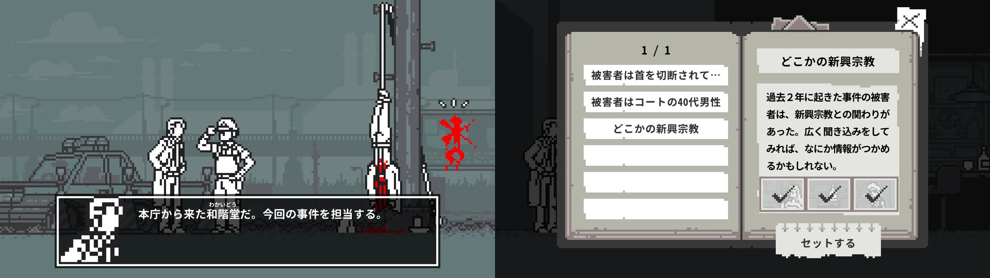 『和階堂真の事件簿』は、ミニマルなドット絵で描かれる推理アドベンチャーシリーズです。