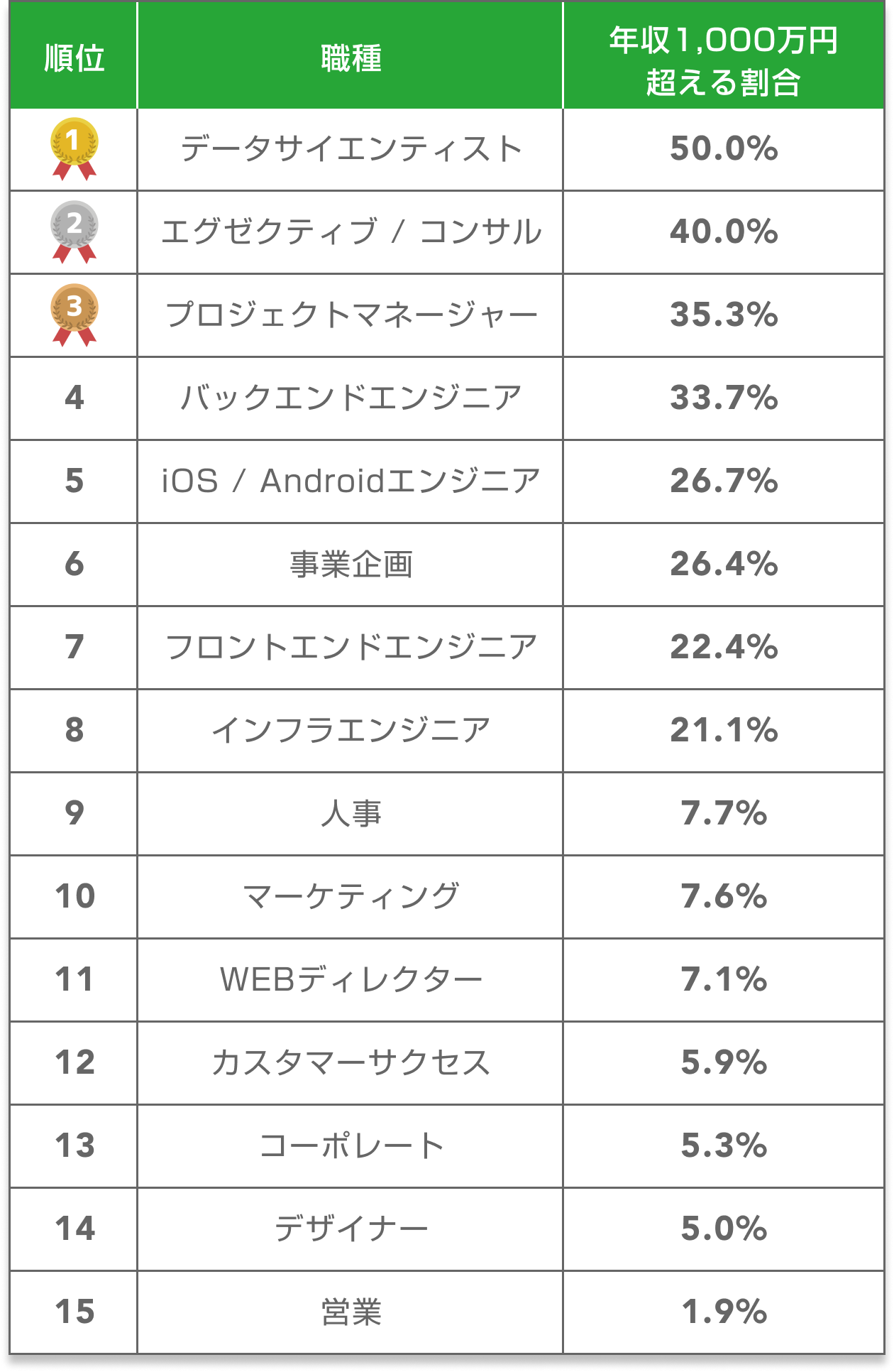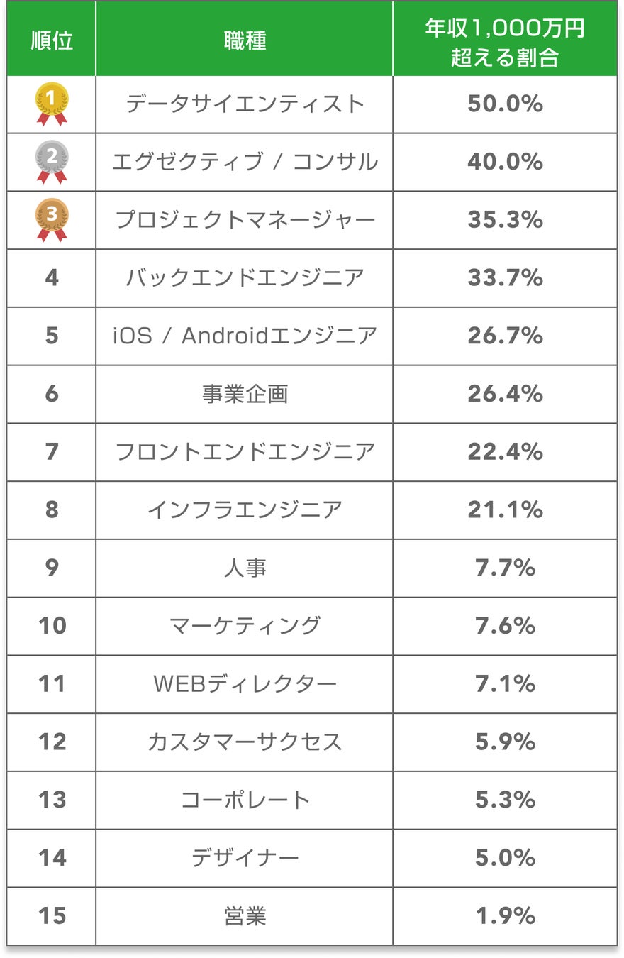 上位4職種は30%、上位8職種は20%が年収1,000万円を超える案件