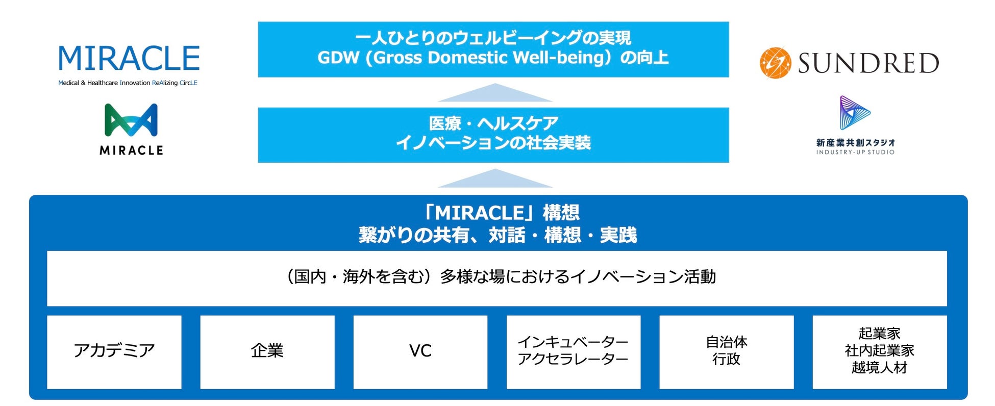 MIRACLE構想とは、大阪大学名誉教授 澤芳樹先生を発起人とした、Well-beingの実現のための医療・ヘルスケアの未来像、21世紀型社会を構想し、医療・ヘルスケア イノベーション エコシステムの共創・社会実装を推進するとともに、イノベーションの加速を通じて一人ひとりの、社会のWell-beingの実現を推進していく取り組みです。共感で繋がる各領域の専門家・プレイヤーが集い、社会起点・目的志向のオープンな対話をもとに、データ基盤の整備、人材育成、研究シーズやスタートアップのインキュベーション、リビングラボの開発などを進めていきます。専門家・プレイヤーがビジョンを共有し繋がりを共有していくことでさらなる繋がりを創出し、対話・共創とプロジェクトの実践を通じ、新たな知識の創造・蓄積を加速していきます。SUNDREDが開発してきた、対話を元に社会起点で新たな価値創造を行い新産業を共創する「新産業共創プロセス」や、立場を越えて社会起点で活動する人材が集まるインタープレナー・コミュニティ、各所のイノベーション活動を集約して社会実装を行うリビングラボの開発プロセスなどを活用し、MIRACLE構想を推進。国内外のイノベーションの場や活動とも連携の上、サイエンスに基づく「Open well-being Innovation」の社会実装を推進していきます。