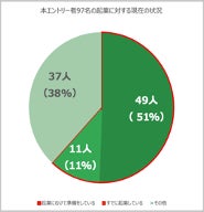 本エントリー97組にアンケートを実施したところ「既に起業をしている」が11%、「起業にむけて準備をしている」が51%で、社会課題解決に向けた何かしらの起業への取り組みを62%の人が、既に実施していることがわかりました。(右図参照)