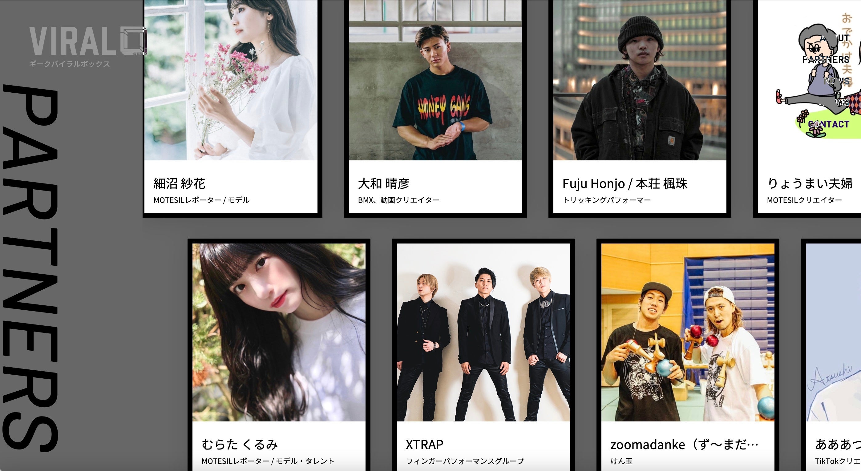 「ギークバイラルボックス」では、創作意欲をもつ方々を募集しております。TV、SNS、音楽、イベント、アパレル、文芸、スポーツなど様々なフィールドで活躍されているインフルエンサー、クリエイター、作家、アスリート、パフォーマー、企業 など、幅広く業務提携パートナーを募集しています。