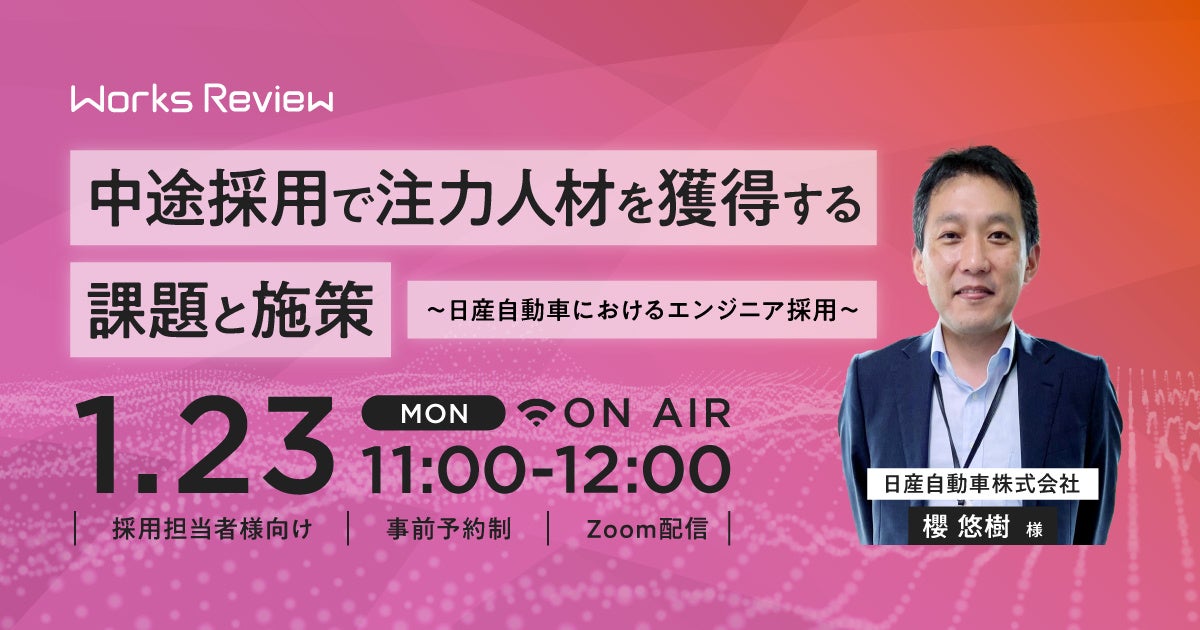 株式会社ワークス・ジャパン(本社:東京都千代田区、代表取締役:清水信一郎、以下 ワークス・ジャパン)は、2023年1月23日(月)に採用業務に従事する部門のご担当者様を対象にしたオンラインセミナー「中途採用で注力人材を獲得する課題と施策〜日産自動車におけるエンジニア採用〜」を開催します。