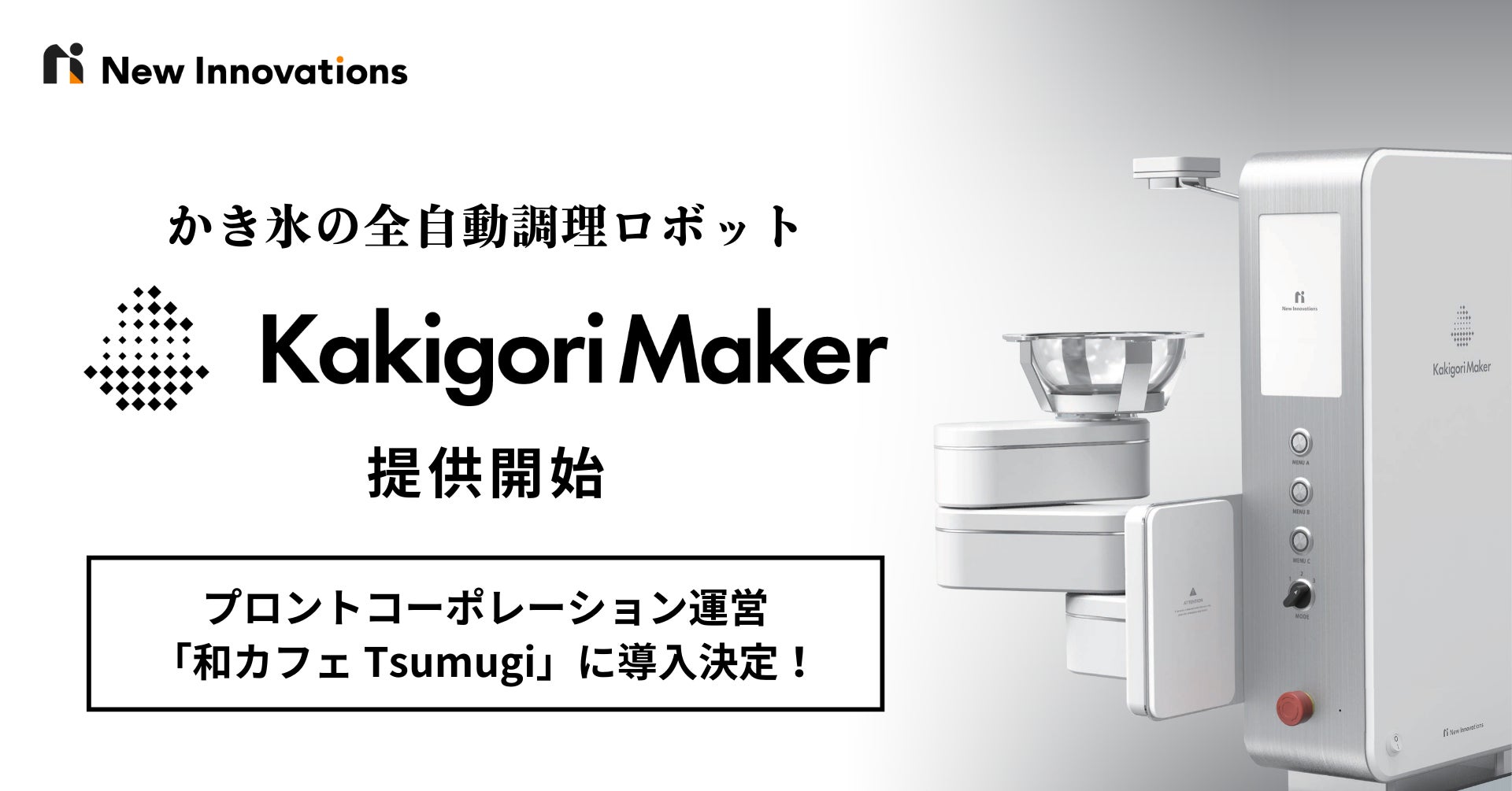 OMOソリューションやスマートコーヒースタンド「root C(ルートシー)」を提供する株式会社New Innovations(本社:東京都江東区、代表取締役CEO兼CTO:中尾 渓人、以下「New Innovations」)は、root C に続く無人調理ロボットとして、かき氷機と自動連携する全自動調理ロボット「Kakigori Maker」を提供開始します。「Kakigori Maker」はプロントコーポレーションが運営する「和カフェ Tsumugi」への導入が決定し、導入第一店舗目となる南町田グランベリーパーク店は7/6(土)にオープン予定です。