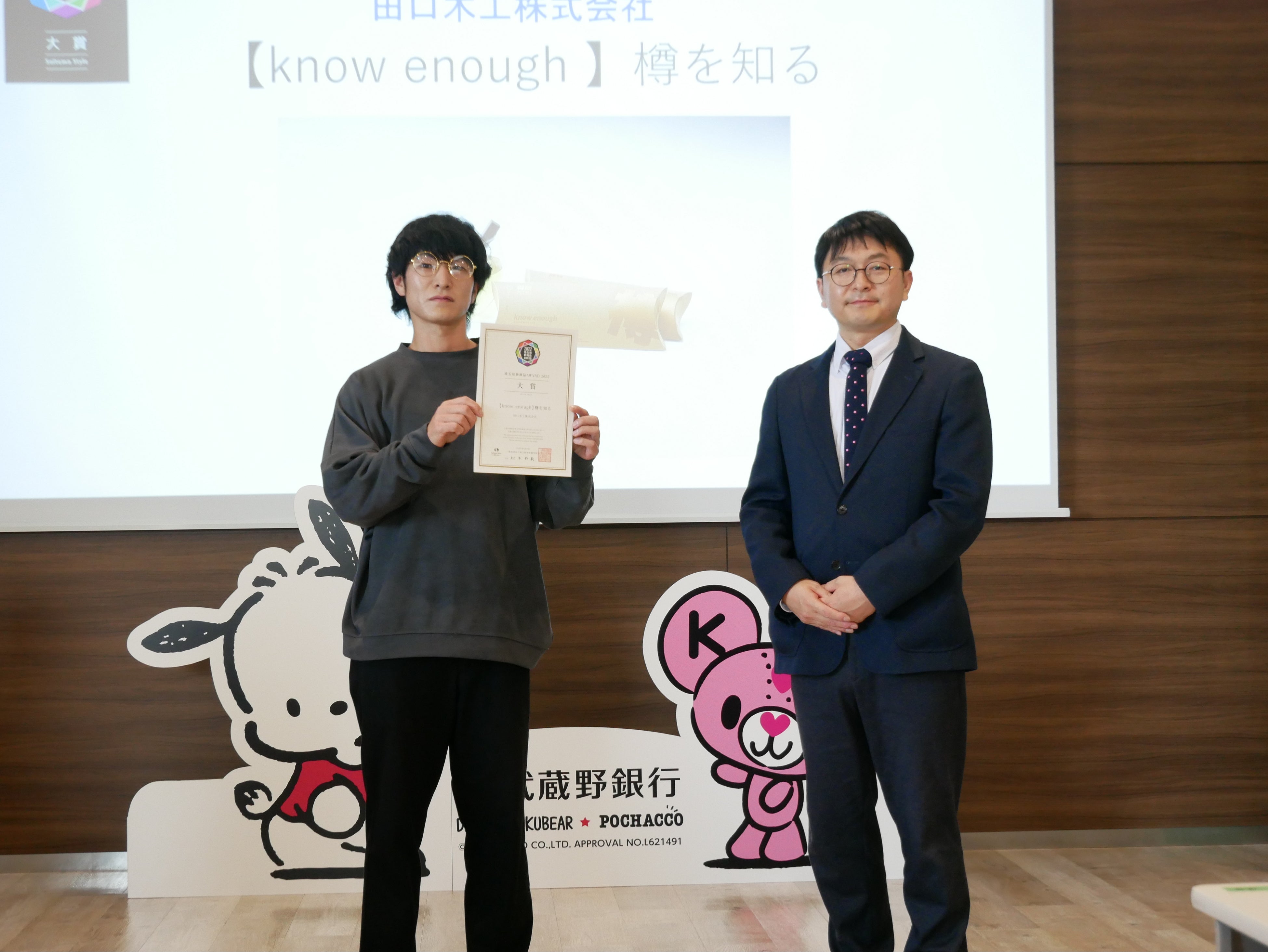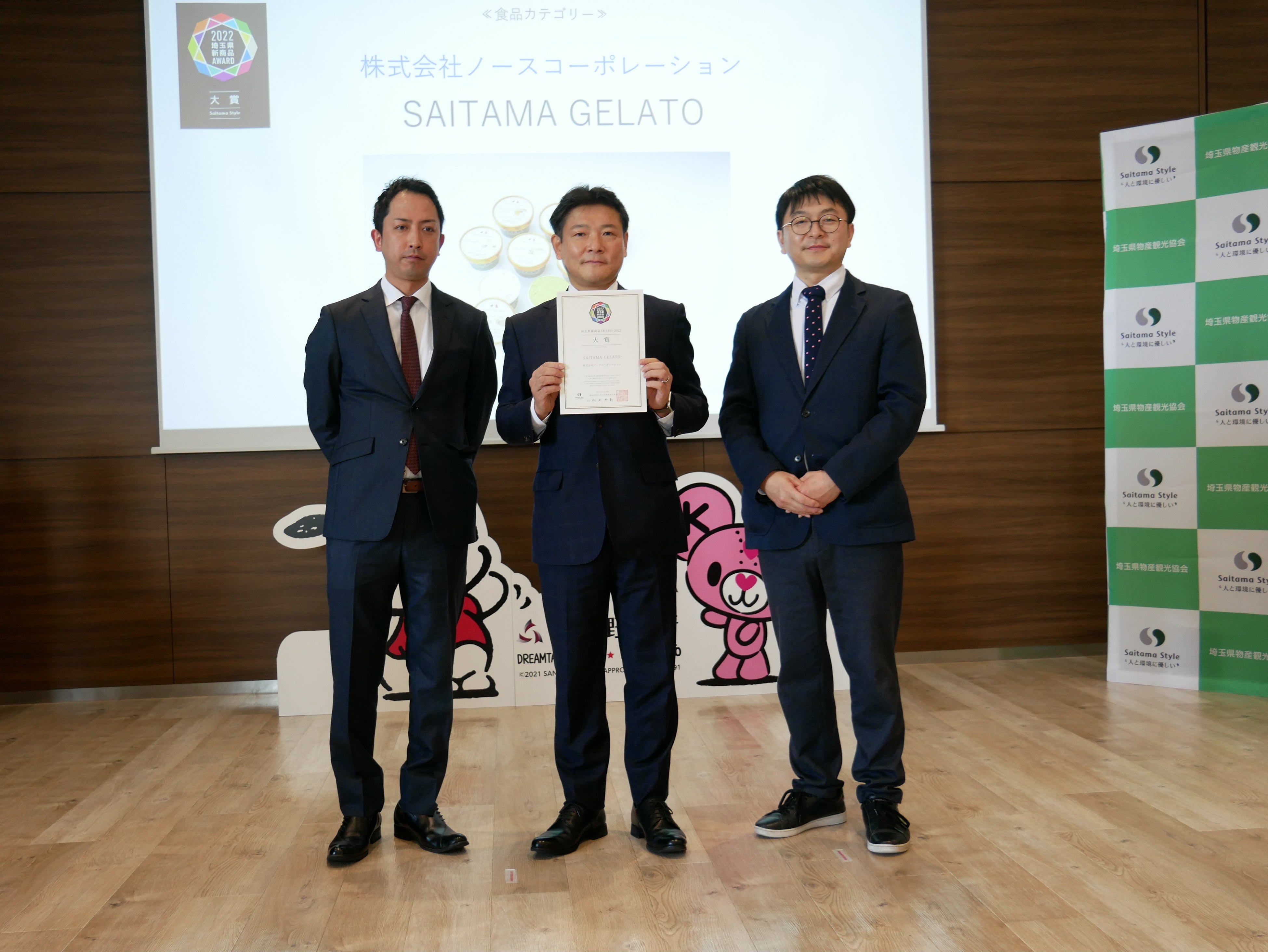 授賞式では埼玉県新商品AWARD 2022にエントリーした58商品の中から、工芸・雑貨カテゴリーで最高点を獲得し、大賞に輝いた「【know enough 】樽を知る」を出品した田口木工株式会社 田口翼氏、食品カテゴリーで大賞に輝いた「SAITAMA GELATO」を出品した株式会社ノースコーポレーション 代表取締役 北 康信氏、シェフ 門平 光正氏が来場し、プレゼンターの埼玉県物産観光協会 副会長である株式会社温泉道場 代表取締役社長執行役員兼グループCEO 山崎 寿樹氏より賞状を授与されました。