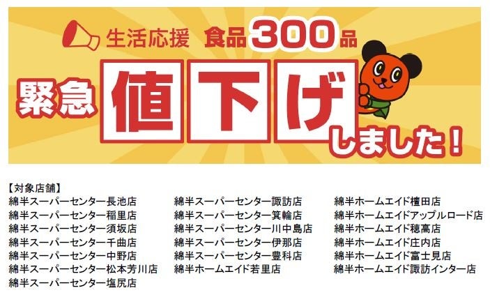 世界的な原材料価格の高騰が続くなか、株式会社綿半ホームエイドは一部の店舗にて加工食品、菓子、飲料といった生活に欠かせない食品最大300品の価格を引き下げ、地域の皆さまの暮らしを応援いたします。
