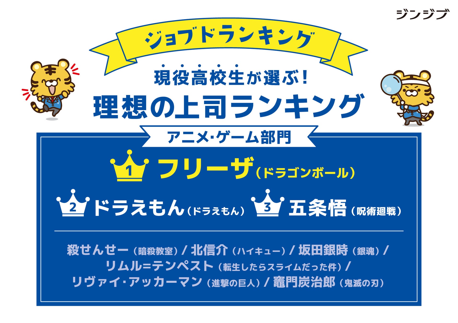 現役高校生が選ぶ「理想の上司ランキング・アニメ・ゲームキャラ部門」では、「ドラゴンボール」の「フリーザ」が2位と倍の差をつけて1位となりました。理由は「悪いキャラで描かれているが、部下に対しての丁寧な言葉や気遣いがちゃんとできるから」「しっかりと褒めるところは褒めるから」「任務をこなせば星1つとかすごくいい報酬をくれる」など、アニメ上で登場する部下キャラへの丁寧な接し方や成果に対しての適正な報酬などが評価され、敵役ながら1位に輝きました。