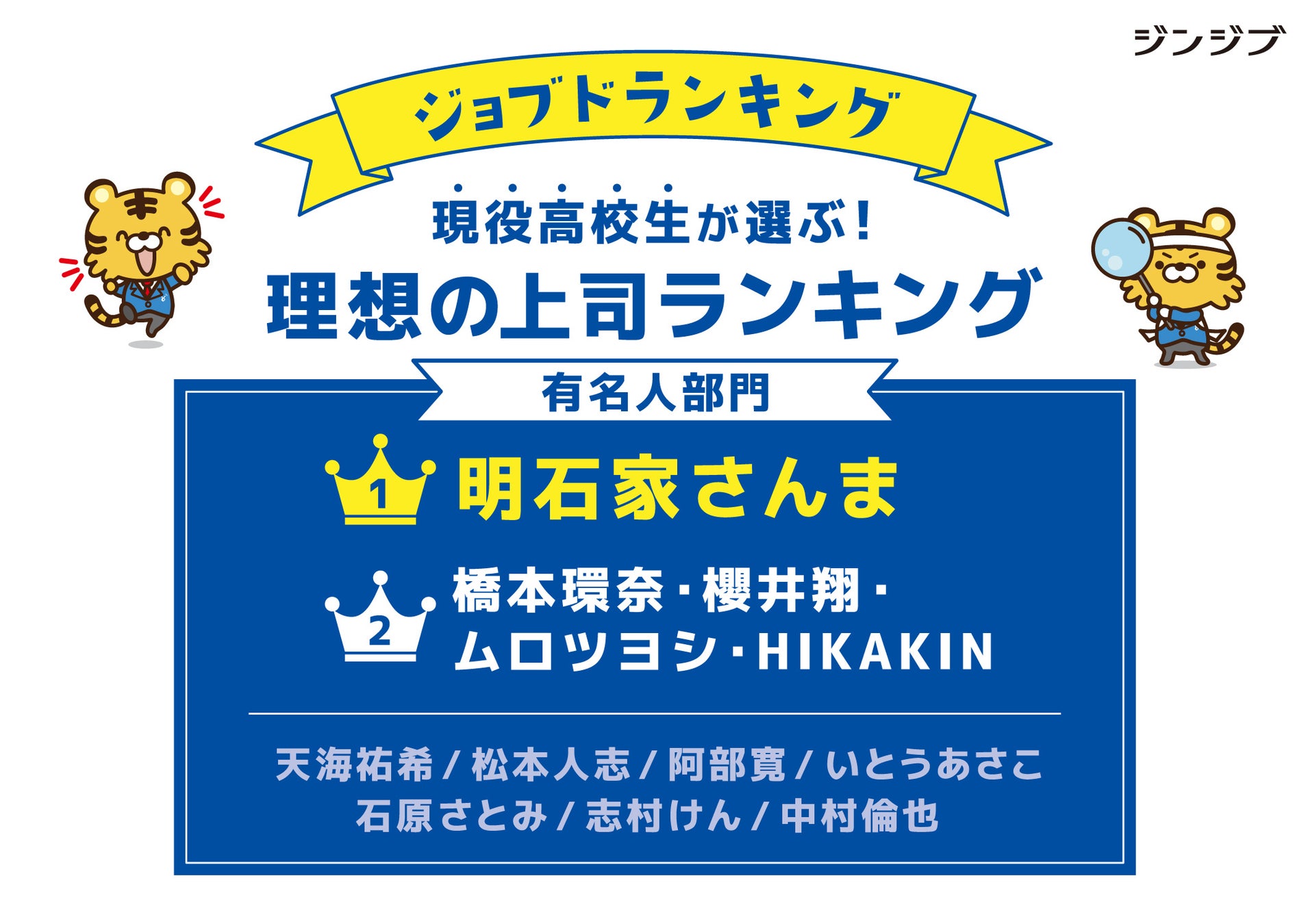 2位の「橋本環奈」は「可愛いは世界を救う」など可愛い人に上司になってほしいという声がありました。「櫻井翔」は「旅行に行く際にきちんと計画を立てるという話を聞いて、どんな時でもしっかりされている方だなと思った」や「ニュースキャスターなどの幅広い活躍」という声があり有能さが指示を集めたようです。「ムロツヨシ」は「場を盛り上げてくれそう」「一緒に仕事していて楽しそうで、しっかりするとこはしっかりしてそう」などムードメーカーとしての支持、「HIKAKIN」は「優しく行動力がある」「人生の経験を教えてくれそう」などの声がありました。高校生の世代は、楽しい雰囲気を作る力とリーダーシップ力の両面を兼ね備えた上司を求める傾向があるようです。