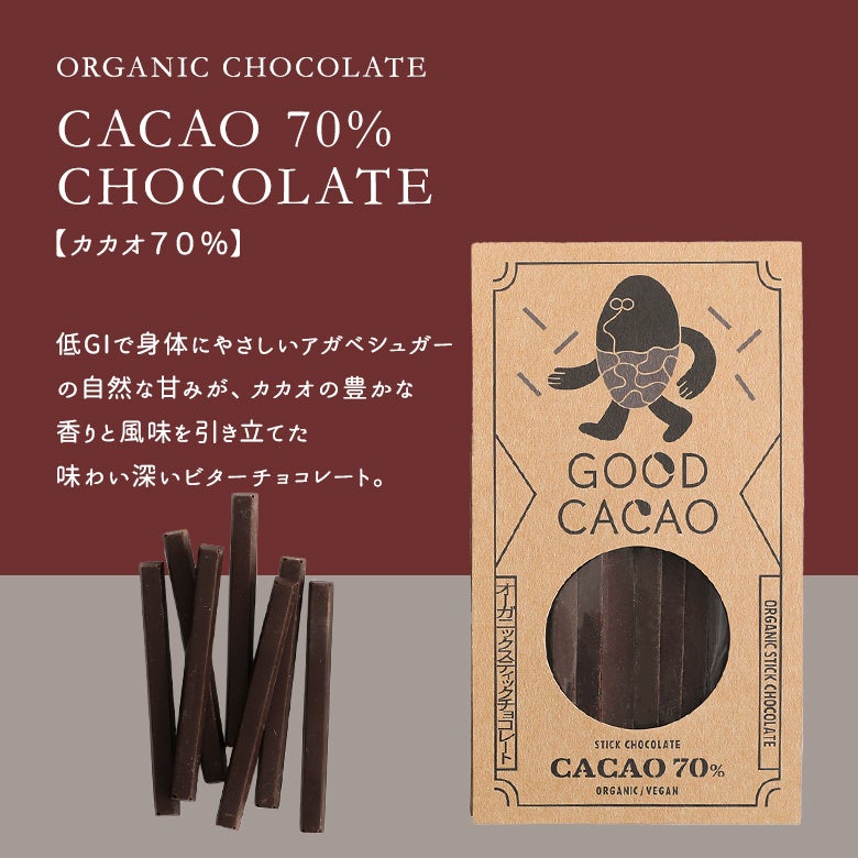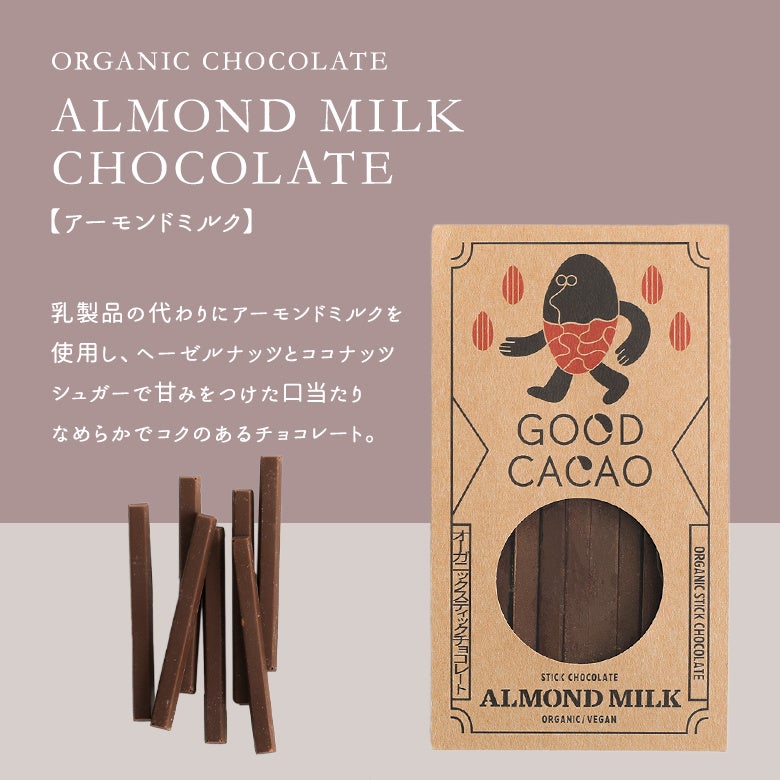 動物性原料を使用せずカカオ本来の美味しさを引き出し、アガベシュガーやアーモンドミルクで優しい味わいに仕上げた、オーガニックスティックチョコレートです。