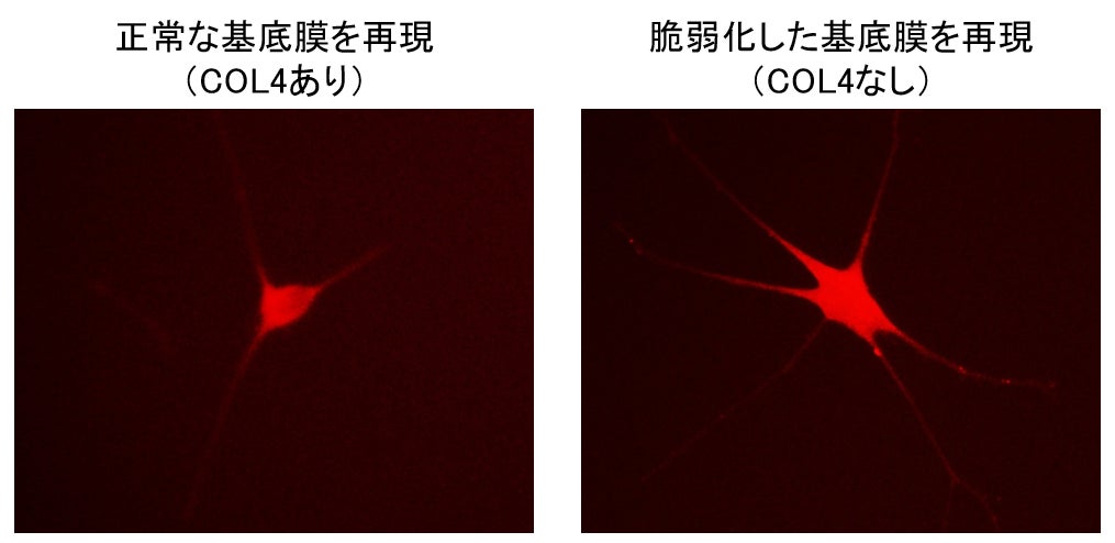 シミ部位のメラノサイトの活性化と基底膜との関連を調べるため、正常な基底膜(COL4あり)と脆弱化した基底膜(COL4なし)をシャーレで再現し、メラノサイトの培養を行いました。その結果、脆弱化した基底膜(COL4なし)で培養したメラノサイトでは、樹状突起が発達し活性化している様子が観察されました(図3)。さらに、メラノサイトの活性化に関与するMITF(Microphthalmia-Associated Transcription Factor)と呼ばれる転写因子の発現が増加するとともに、メラニン生成に関わる酵素チロシナーゼ(TYR: Tyrosinase)の発現も増加していました(図4)。