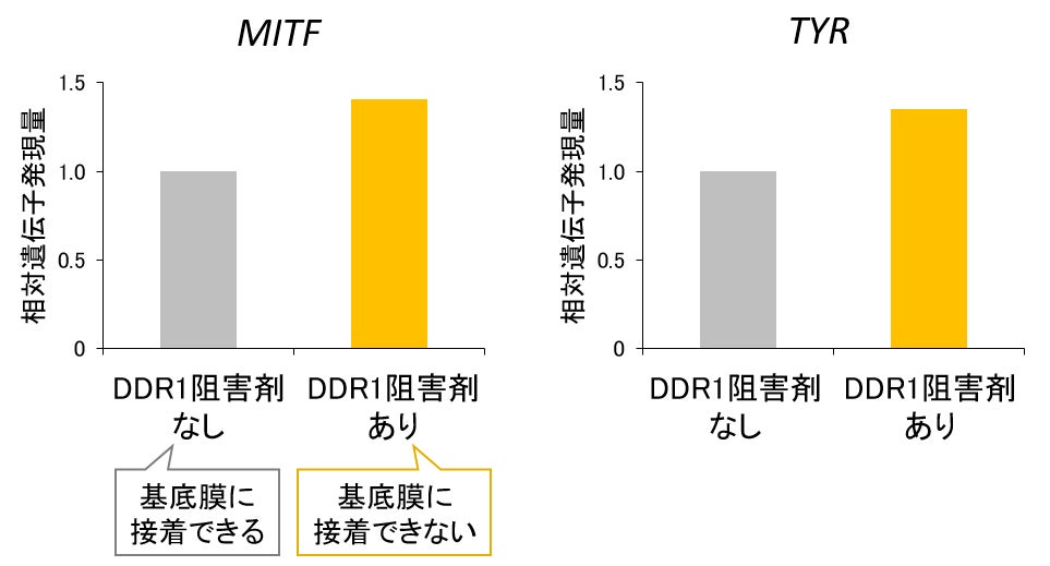 また、正常な基底膜(COL4あり)で培養したメラノサイトに、基底膜とメラノサイトの接着を阻害する物質(DDR1阻害剤※2)を添加すると、MITFやTYRの発現が増加することも確認しました(図5)。