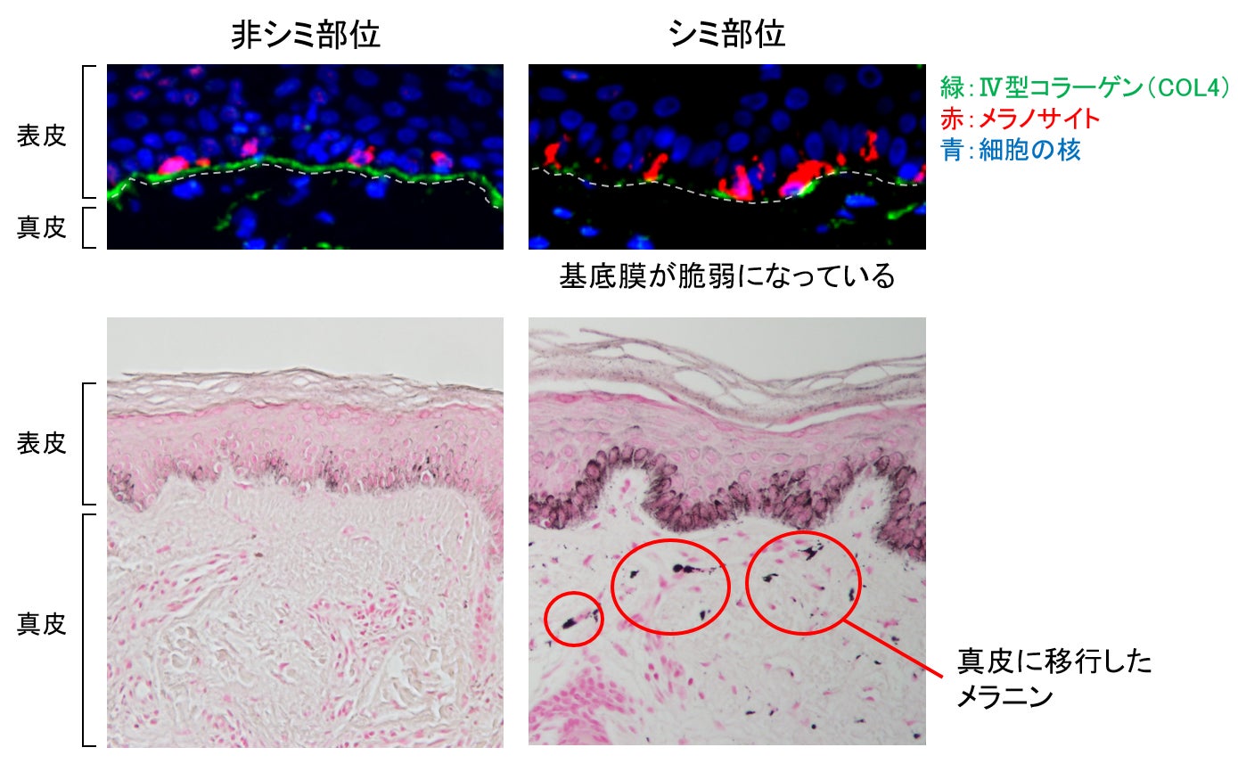 皮膚にシミがある部分では基底膜の脆弱化が起き、メラノサイトが活性化して過剰にメラニンを生成していることを発見