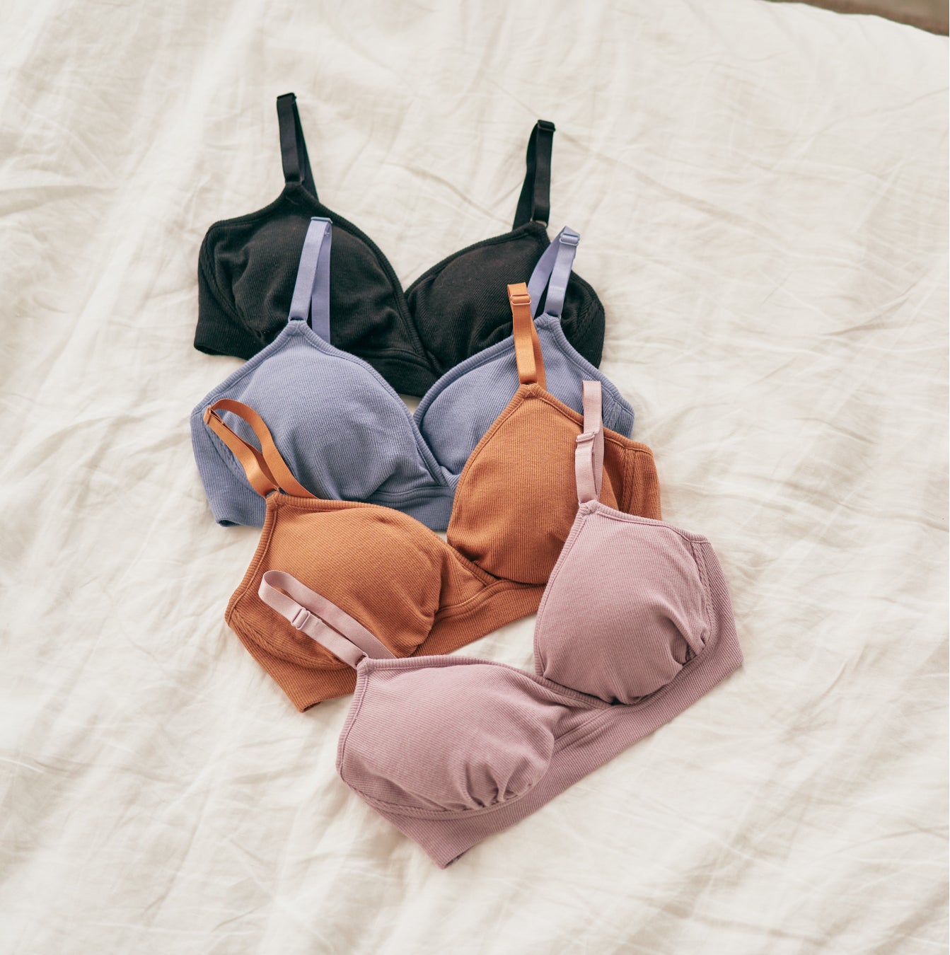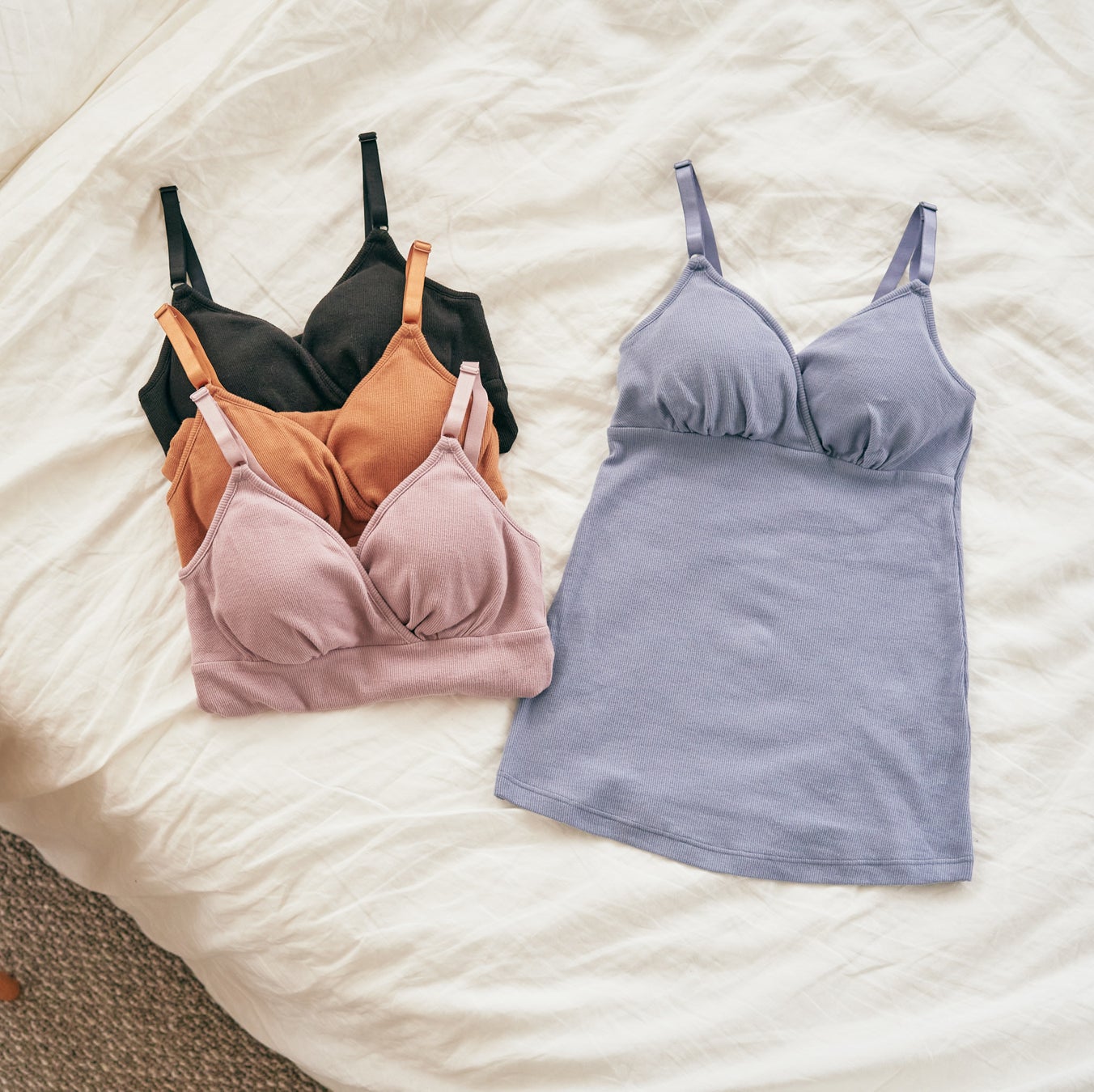 「吸水パッド付き授乳インナー」は快適な着用感にこだわりました。肌に優しい綿混素材で、母乳の吸収後もさらっとした着心地です。また機能性だけではなく、おしゃれも同時に楽しんでほしいという思いからカラフルな4色のバリエーションをご用意しました。キャミソールとショーツも同色で展開しているので、妊娠中・授乳中もお揃いの下着で合わせていただけます。
