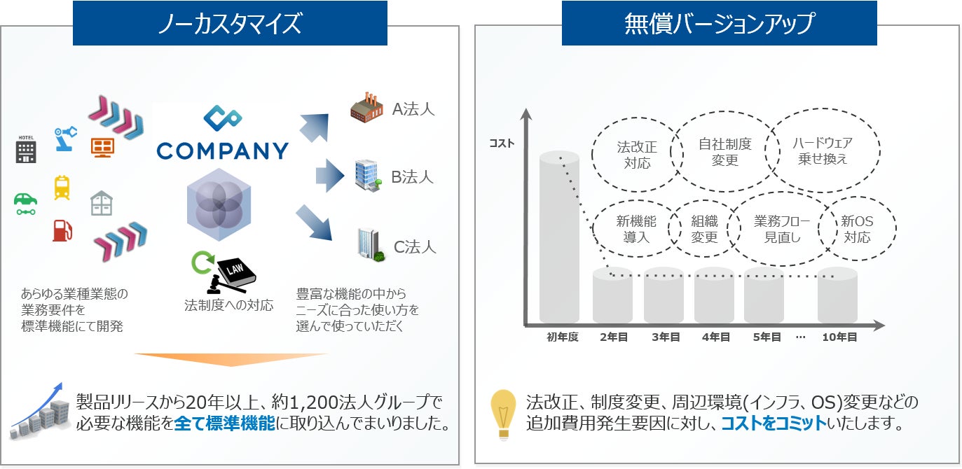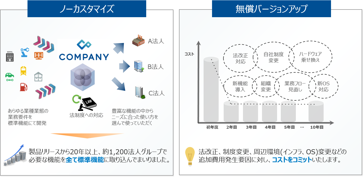 企業環境の変化に対応するための標準機能の強化を、定額保守料の範囲内(無償バージョンアップ)で行うことで、大手法人の人事業務効率化、ITコストの見える化に貢献いたします。