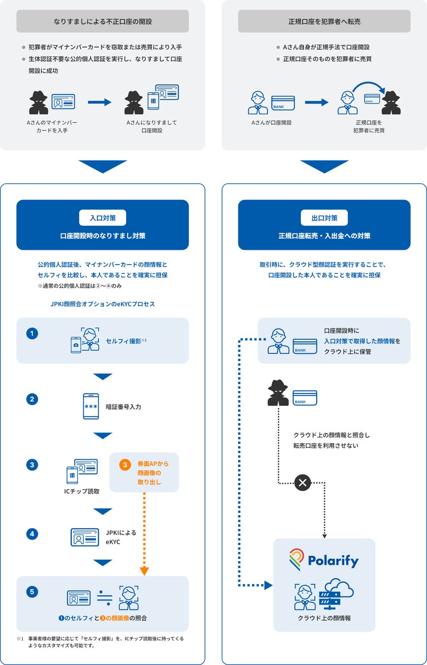 例えば、口座開設時にマイナンバーカードの顔情報とセルフィの顔写真を照合することで、本人確認を行い、なりすましを防止します。