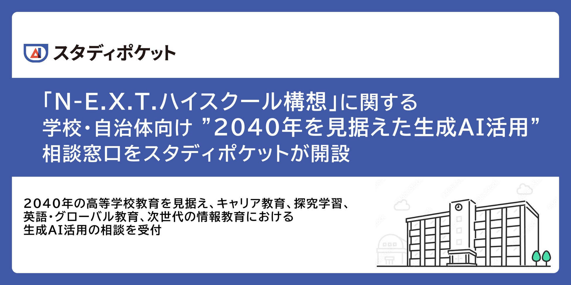 スタディポケット株式会社(本社:東京都千代田区、代表取締役:山地瞭/鶴田浩之、以下「スタディポケット」)は、文部科学省が掲げる高校教育改革「N-E.X.T.ハイスクール構想」(産業イノベーション人材育成等に資する高等学校等教育改革促進事業)に関する、学校・自治体向けの生成AI活用の相談窓口を開設いたしました。
