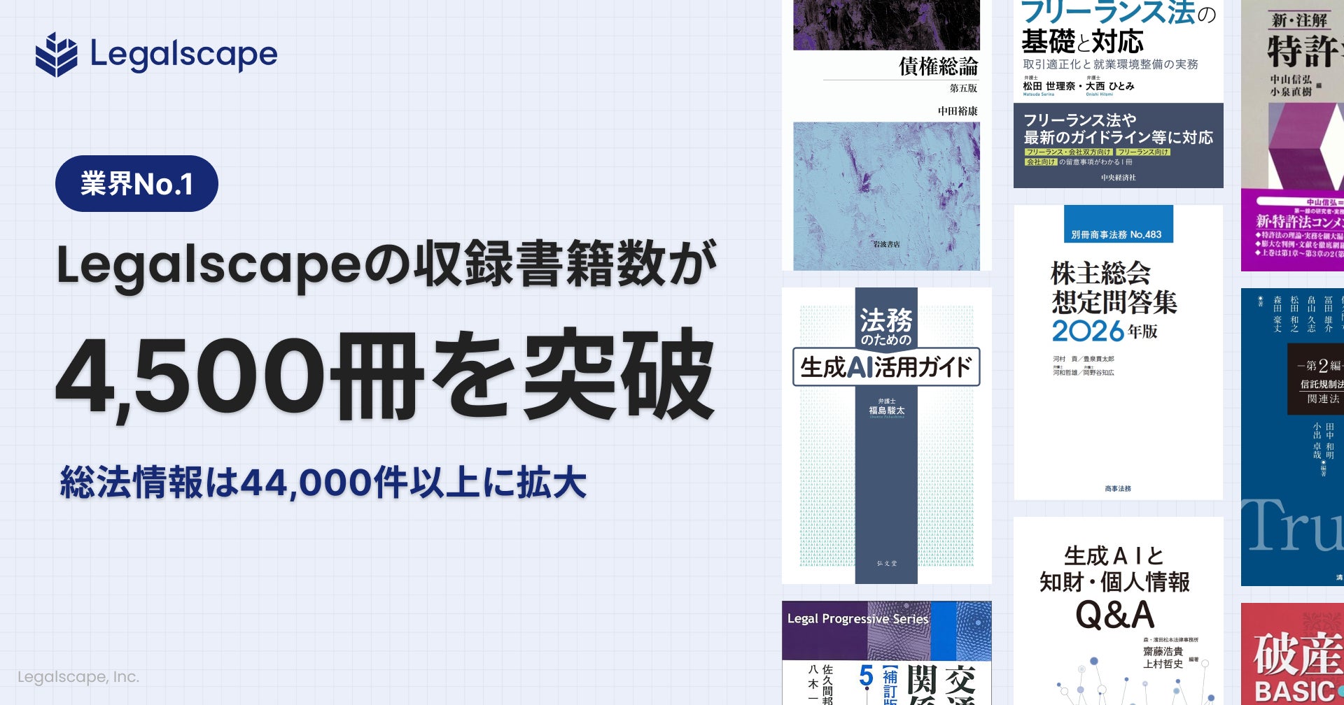 【業界No.1】リーガルリサーチプラットフォーム「Legalscape」、収録書籍数が4,500冊を突破。総法情報は44,000件以上に拡大
