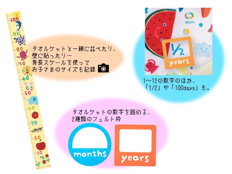 『月齢フォトを撮ろう! すくすくタオルケット』には、月齢フォトのフレームとなるタオルケット、「months」「years」のフェルト枠、100㎝まで測れる身長スケール、スマホ撮影アドバイスを紹介した使い方BOOKが入っているので、この1セットで手軽にかわいく月齢フォトを撮影することができます。