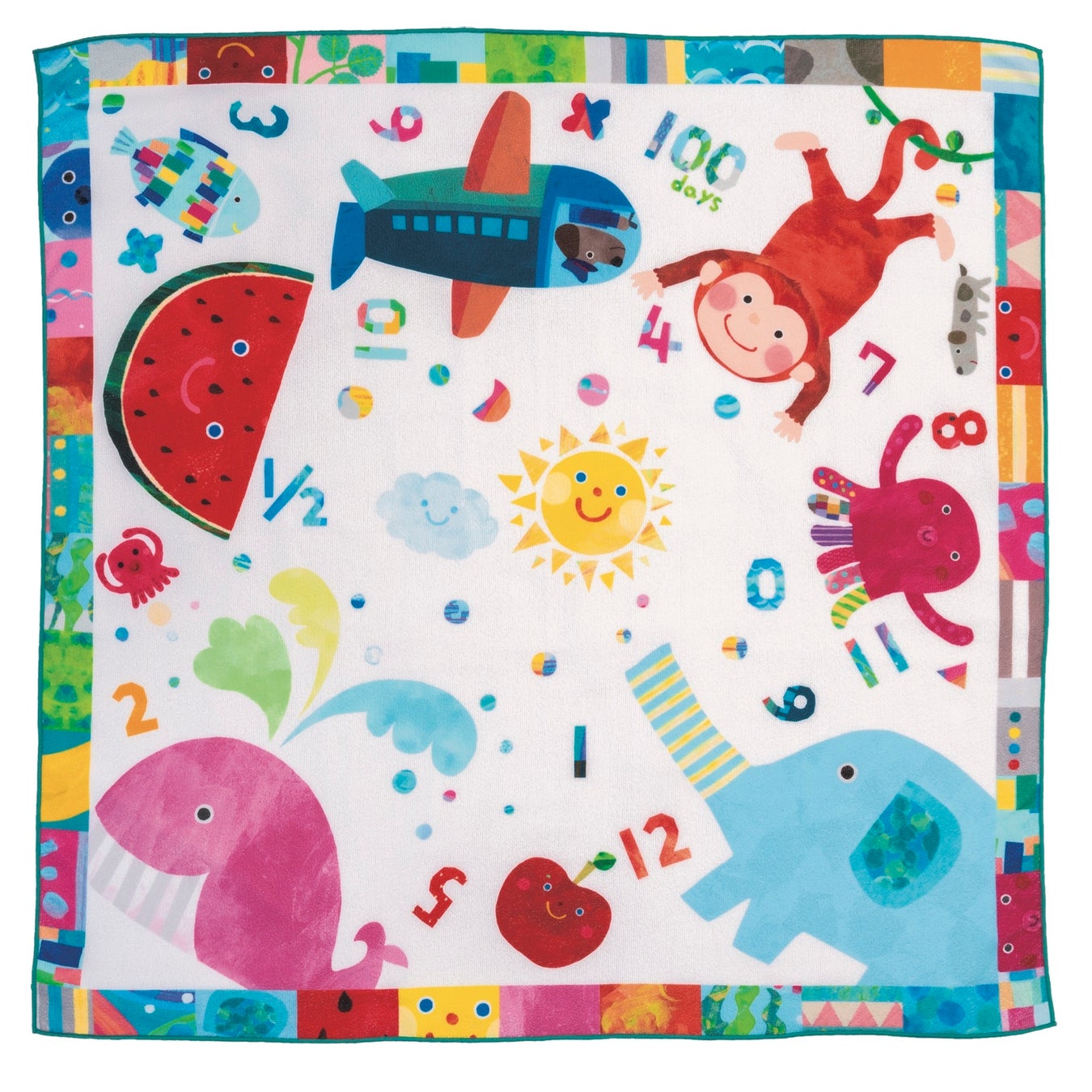 どの角度から撮ってもOK!やわらかい素材のタオルケットに、動物やくだもの、のりもののイラストをランダムに散りばめました。スイカの上に乗ったり、サルさんと手をつないだり……。お子さまとキャラクターたちとのコラボレーションをお楽しみください。