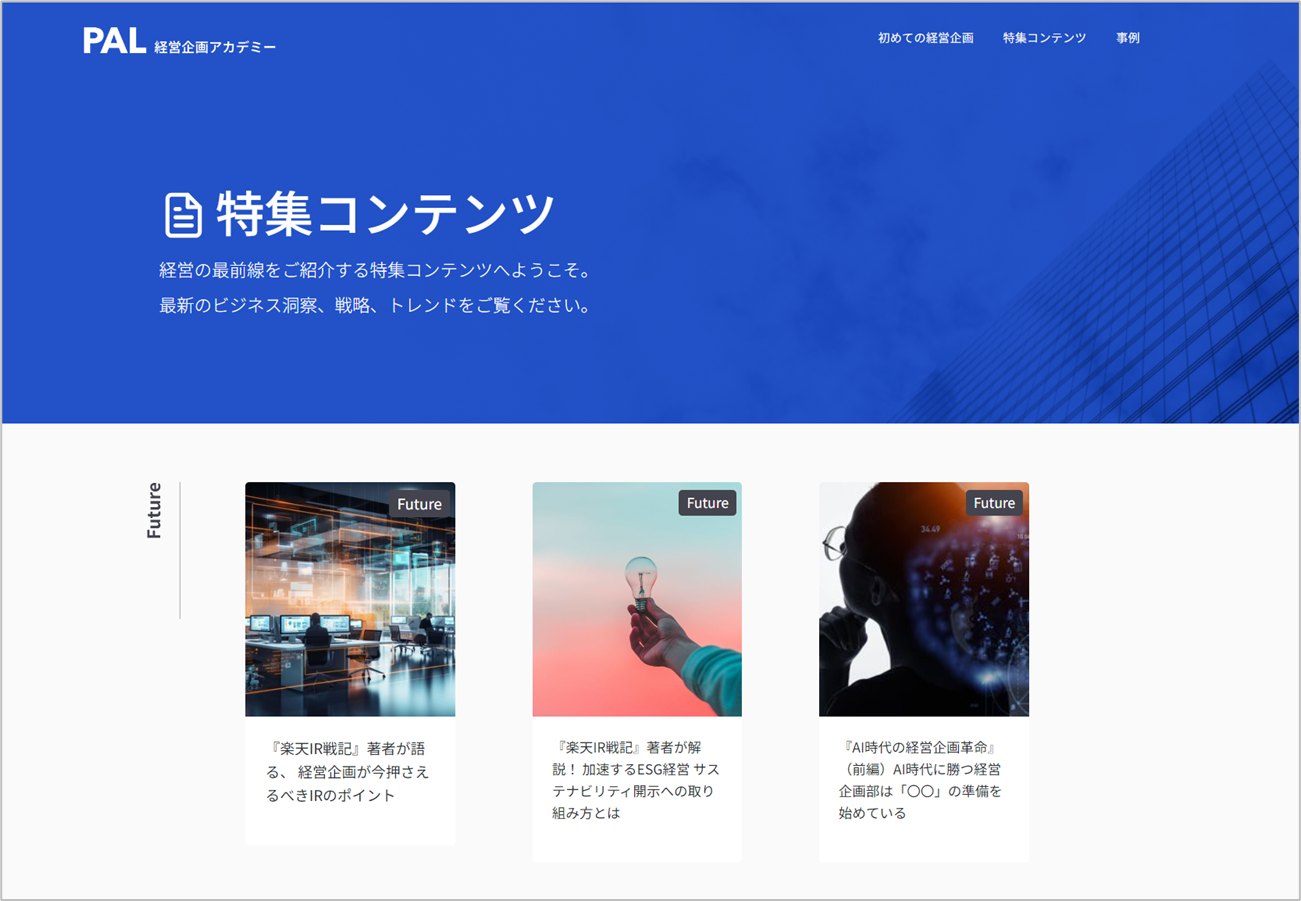 『経営企画アカデミー』では、初めて経営管理業務に携わる方がステップを踏みながら段階的に実践ノウハウを学べる記事をはじめ、国内・海外の経営に関する最新トレンドについて情報提供を行います。経営企画部門出身の当社メンバーが企画・監修することで、現場で本当に役立つ情報提供を行い、企業の経営変革を後押しします。