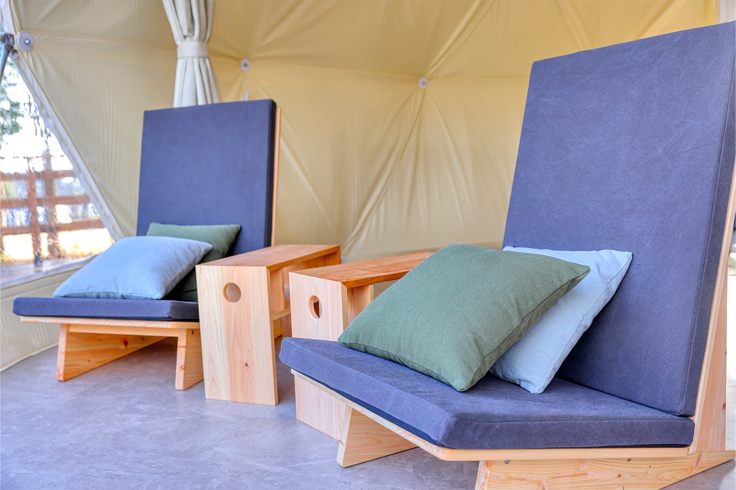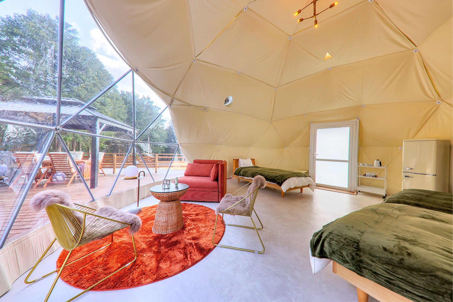 全8棟のドームテントは直径7Mの大空間が広がる大型のお部屋や、富士宮市初の仕様となる専用ドッグラン付きのお部屋、天然木の温かみと安らぎを感じる浜松市の家具メーカー「キシル」とコラボしたお部屋と、個性豊かな3種の部屋タイプをご用意しております。いずれも1貸切仕様・冷暖房完備で、一年中快適にお過ごし頂けます。