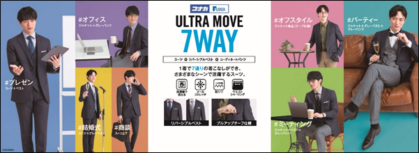 70周年記念企画としてコナカ・フタタが持つ素材開発力、SPAシステムによる縫製技術と、オリジナリティ溢れるデザイン力を生かして開発した、1着で7通りの着こなしができるオールオケージョンスーツです。