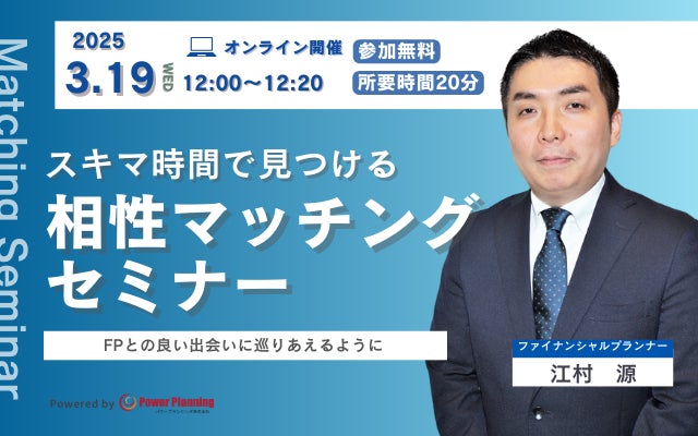 無料マネーセミナー提供サービス「アットセミナー」を運営しているパワープランニング株式会社が「3月19日 (水)12時」に「相性マッチングセミナー」というスキマ時間で自分に合ったFPを見つけられるオンラインセミナーを開催いたします。