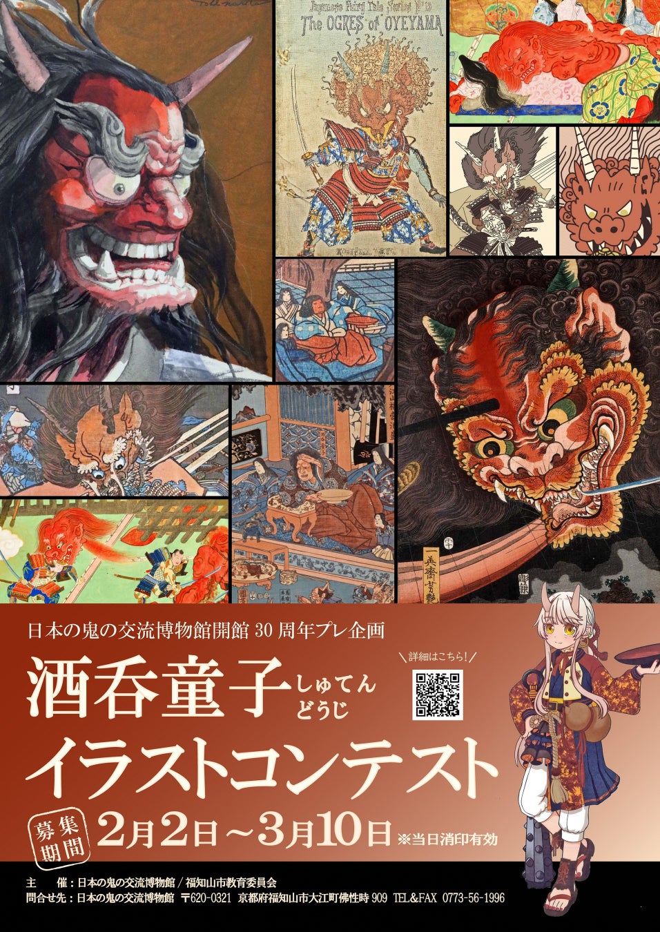 酒呑童子イラストコンテスト 鬼博 郵送 ②日本の鬼の交流博物館が2023年4月で30周年を迎えるのに先駆けて、「酒吞童子イラストコンテスト」を開催!大江山に棲んでいたとされる鬼の総大将「酒呑童子」を自由な発想で描いてください。「酒呑童子賞(最優秀賞)」の作品は、博物館開館「30周年記念来館証」のデザインに採用し、博物館で配布します。また、応募作品はすべて博物館内に展示します。
